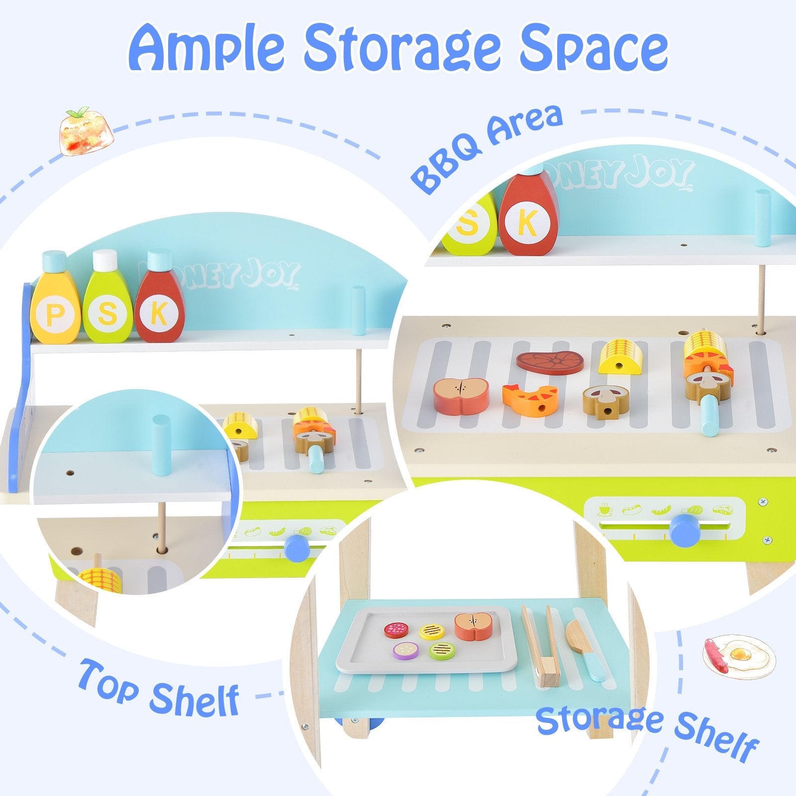 ● Sufficient Storage Space: There is a top shelf with 2 holes for condiments and skewers. The wide BBQ area is large enough to hold all barbecue food toys and tools. Apart from that the bottom storage shelf offers added room. The classified storage space will help kids learn to organize different accessories.