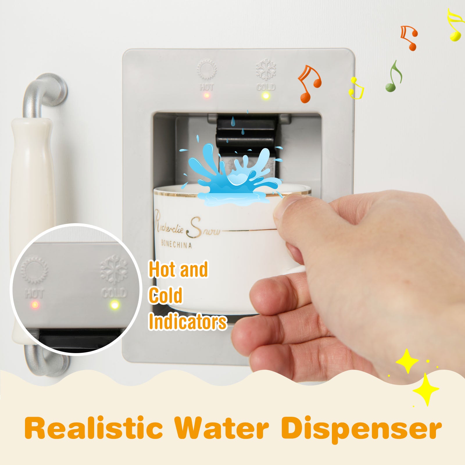 ● Realistic Features: This wooden play kitchen offers kids real cooking experience. When they place the cup under the water dispenser it will display hot and cold indicators. Toddlers are also allowed to wash vegetables in the sink turn on the range hood and cook on the stove.