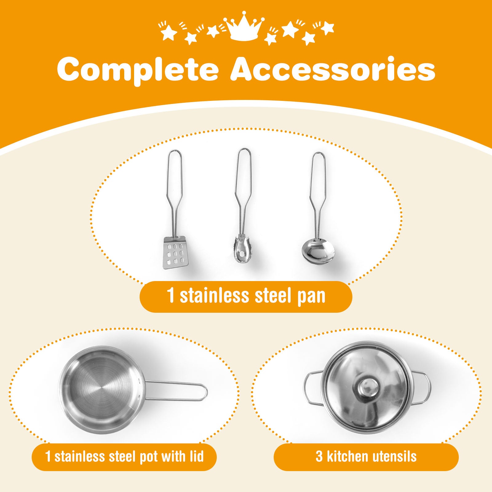 ● Abundant Accessories: The kitchen play set comes with 1 stainless steel pan 1 stainless steel pot with lid and 3 kitchen utensils. When not in use all accessories can be stored in the storage cabinet.
