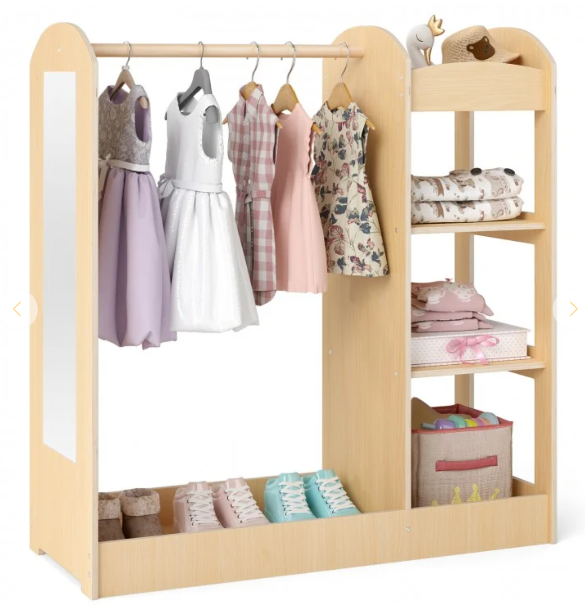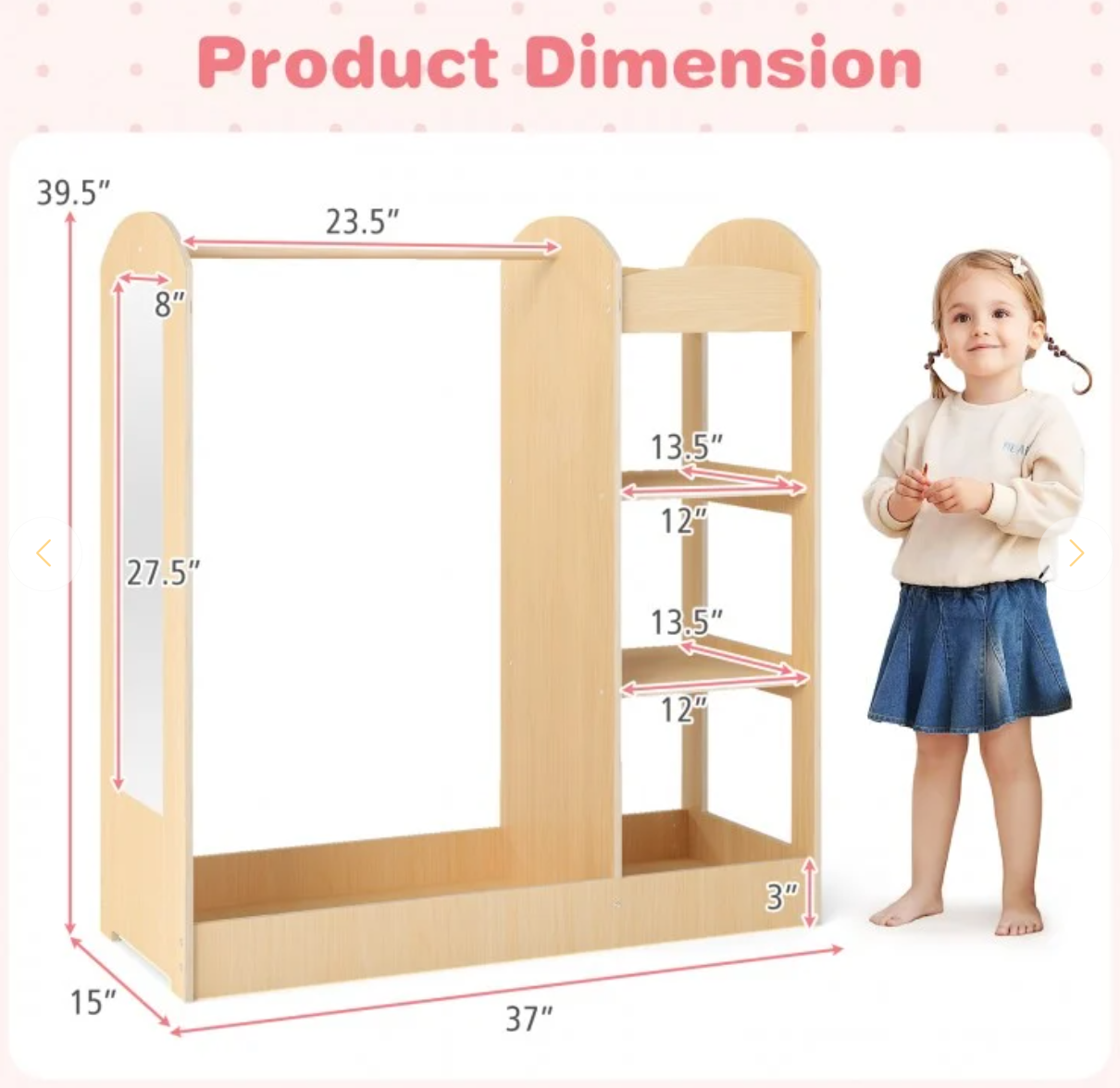 ● Child-Size Design and Kid-Safe Mirror: This dress-up center is specially designed for kids over 2. With 39.5" reasonable height and open design, this kid's closet allows kids to conveniently store or remove clothes. Besides, exquisite mirror enables kids to better dress up.