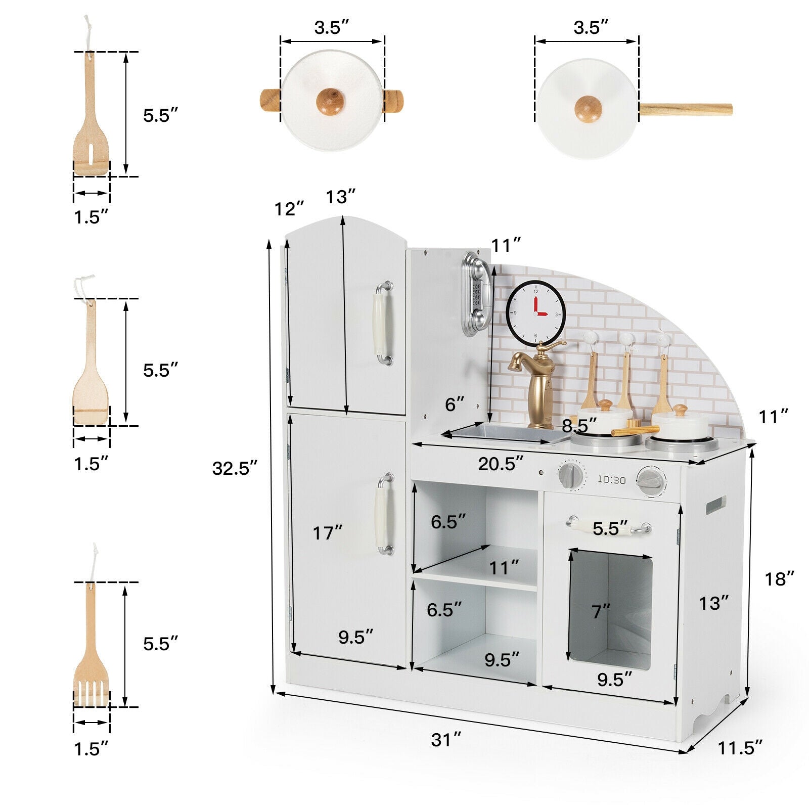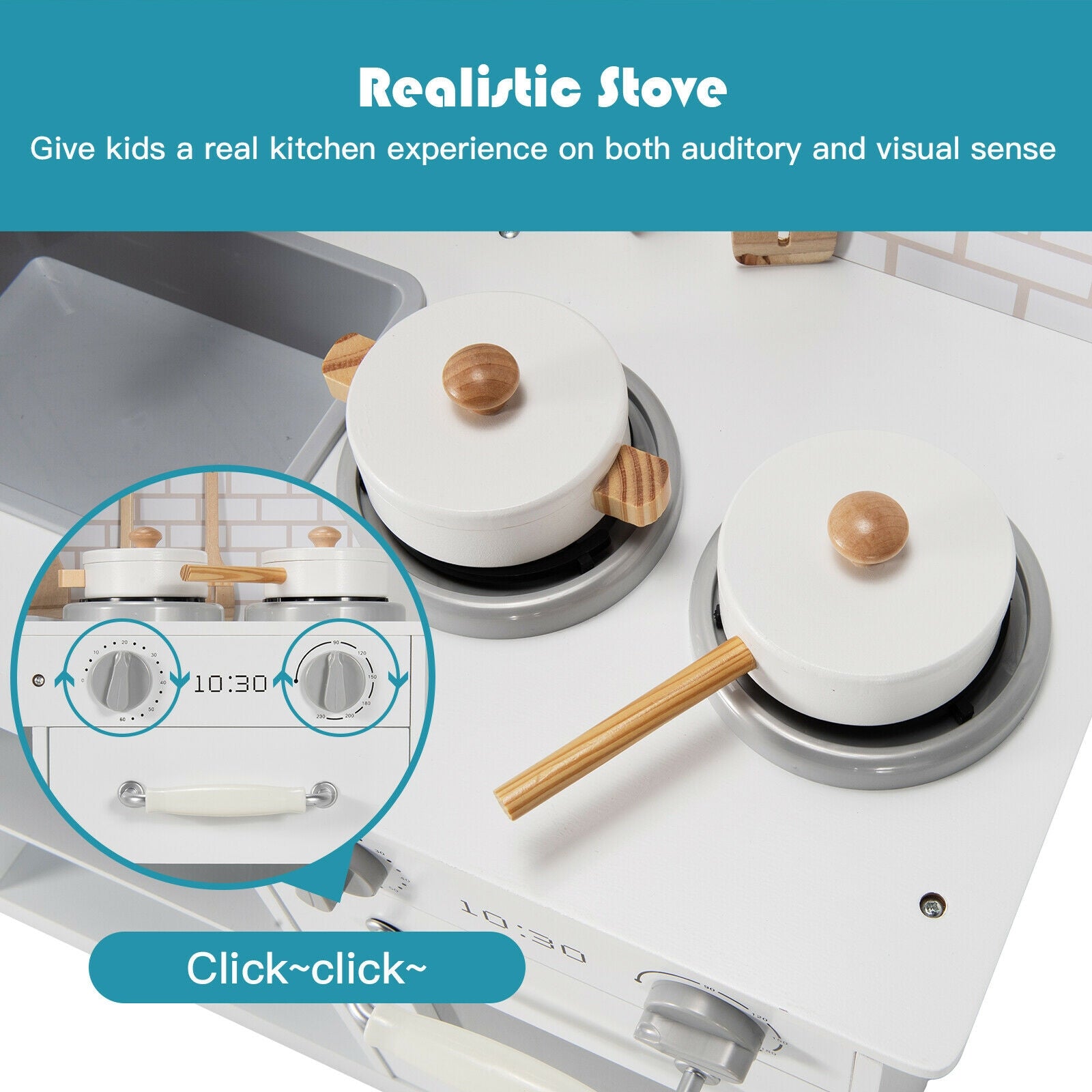 ● Safe and Durable Material: The kitchen playset is made of selected and high-quality MDF and has passed ASTM certification. Free of bad smells and harmful elements this product ensures your kid’s good health. Other than that solid structure and durable material make the playset able to accompany your baby for a long time.