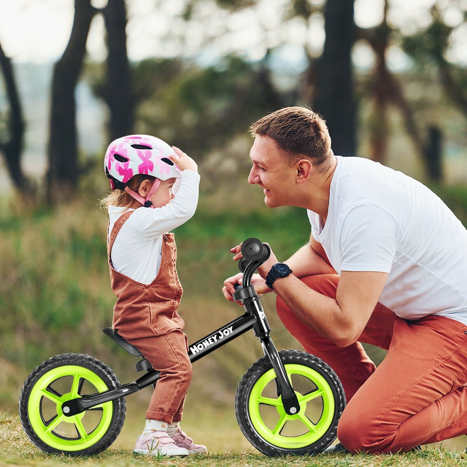Made of sturdy yet lightweight carbon steel frame this kids balance bike is durable and portable for kids to carry. What’s more the puncture-proof and shockproof EVA tires fit various roads for practicality. After arriving at the desired place you can teach your children to grab the anti-slip handlebar and sit on the soft padded seat which makes them learn to keep balance slowly and safely. In this process this kid's balance bike not only promotes the parent-child relationship but also gives confidence to your children. If other kids want to ride this training bike just adjust the handlebar (18.5" - 20") and seat (13" - 15") to fit their heights.