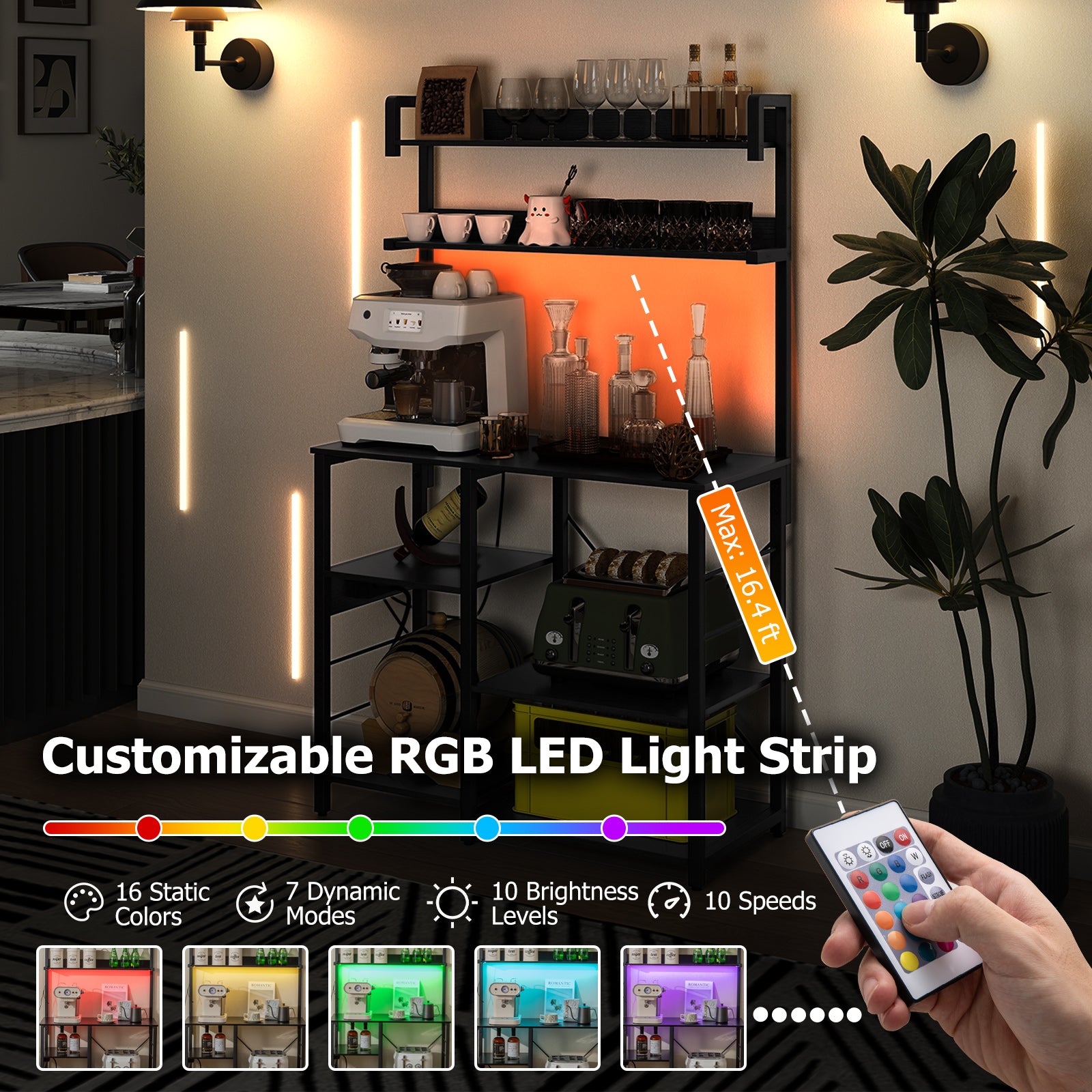 Customizable Ambience Lighting: With a customizable RGB LED light strip our coffee bar station offers 16 static colors 7 dynamic modes 10 brightness levels and 10 speed settings. It allows you to create the ideal ambiance for cooking or entertaining in your kitchen or dining area.