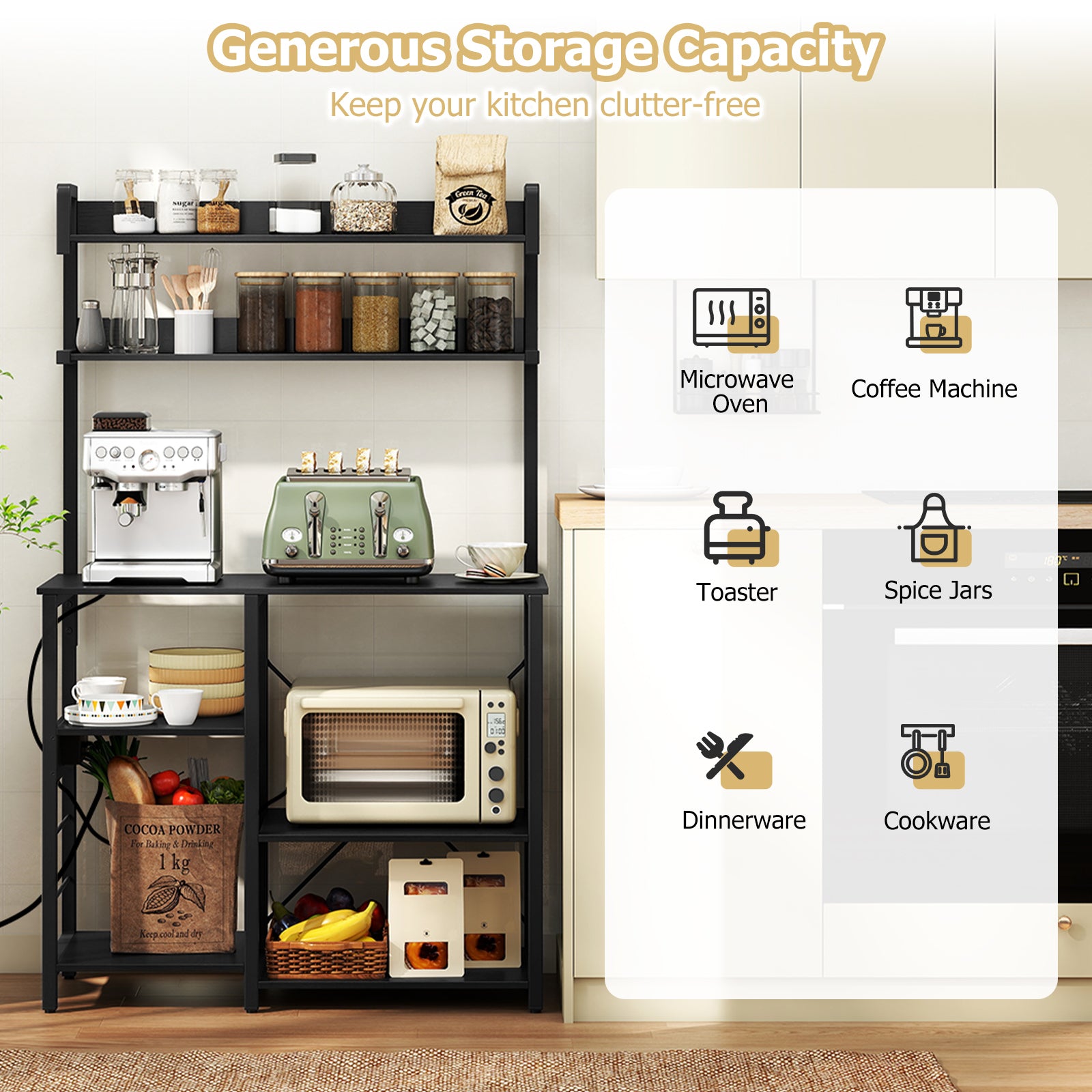Integrated Charging Station: This kitchen bakers rack is equipped with a built-in charging station featuring 2 AC outlets a USB port and a Type-C port. It powers kitchen appliances directly on the stand reducing countertop clutter and enhancing convenience.