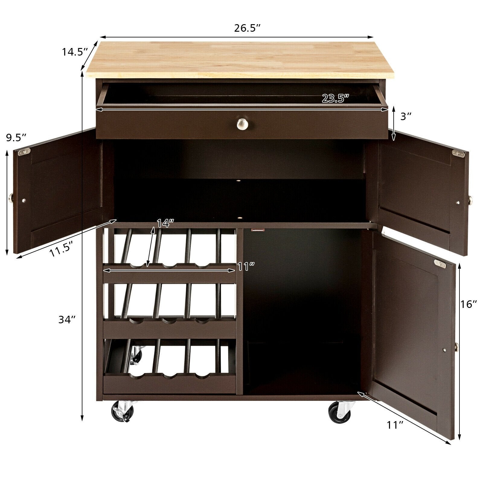 ● Diversified and Ample Storage Space: A spacious countertop measuring 26.5" x 14.5" offers ample space for food preparation. Besides  the cart comes with a drawer and two cabinets. This diversified storage space keeps all your plates  kitchen essentials  spice jars well organized. And the 3-tier wine rack sorts your wines of different kinds  also keeping them within your arm's reach.