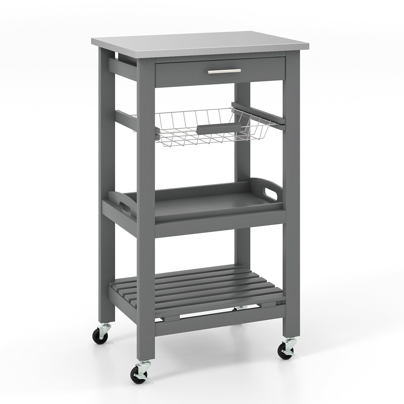 -Features a stainless steel top a spacious pull out storage drawer a slide out wire basket a removable tray and a detachable shelf
