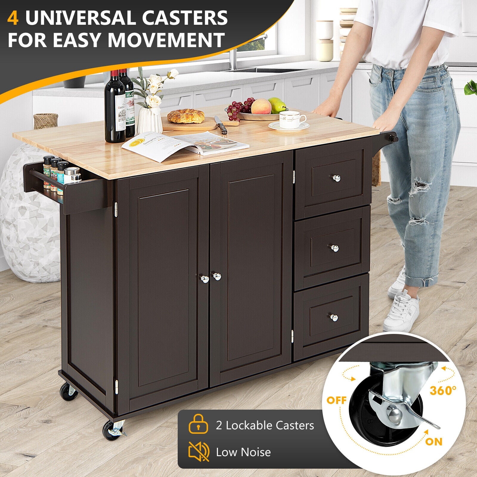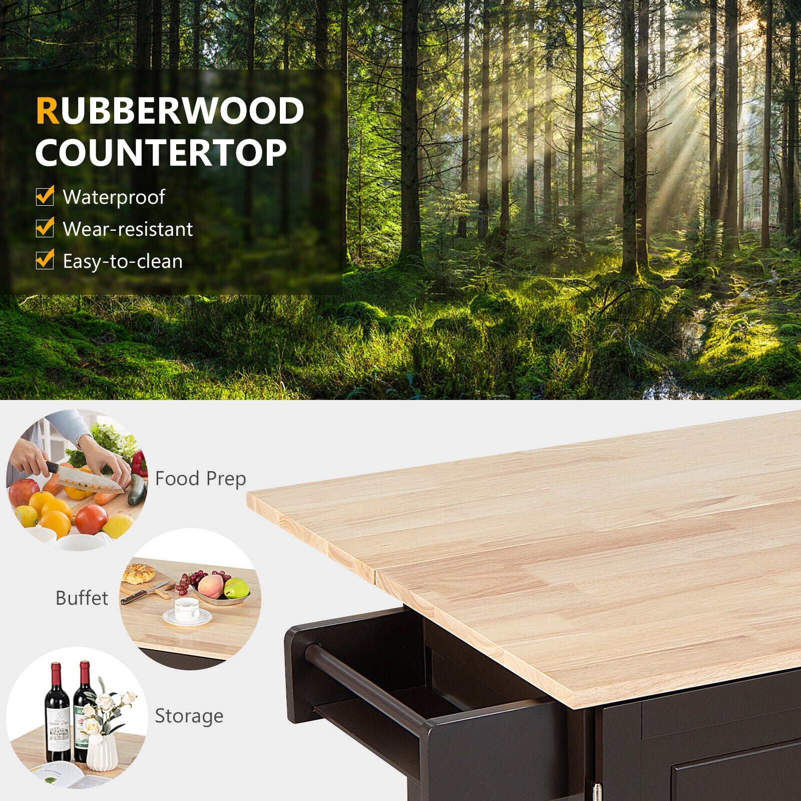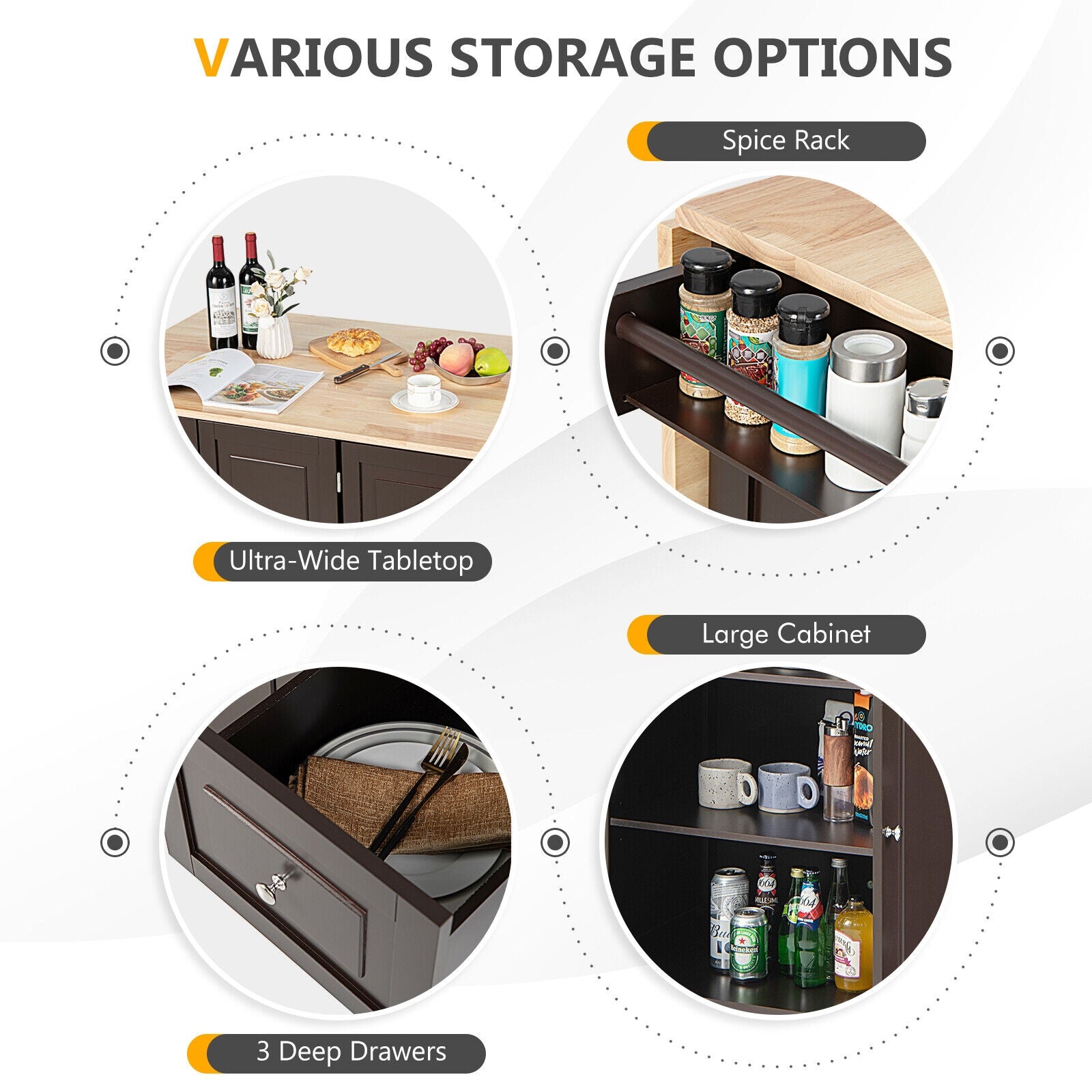 ● Plenty of Storage Options: A large rubberwood top a spacious cabinet and 3 storage drawers can provide you with a lot of space to keep your items in order. Along with a uniquely designed spice rack and removable towel rack on the side you can place small cans and bottles and place towels conveniently. Additionally the drawers are equipped with a slide rail for easy use.