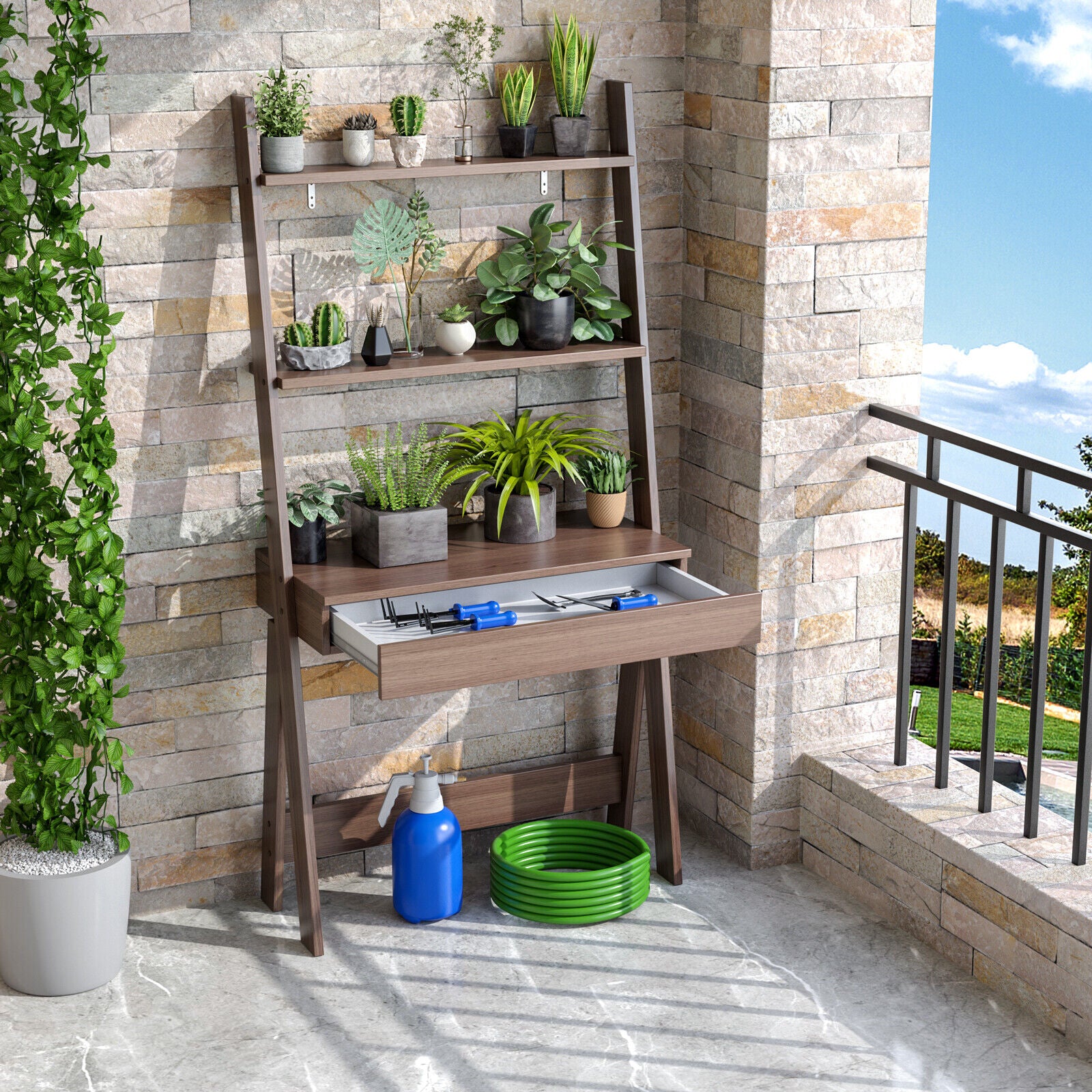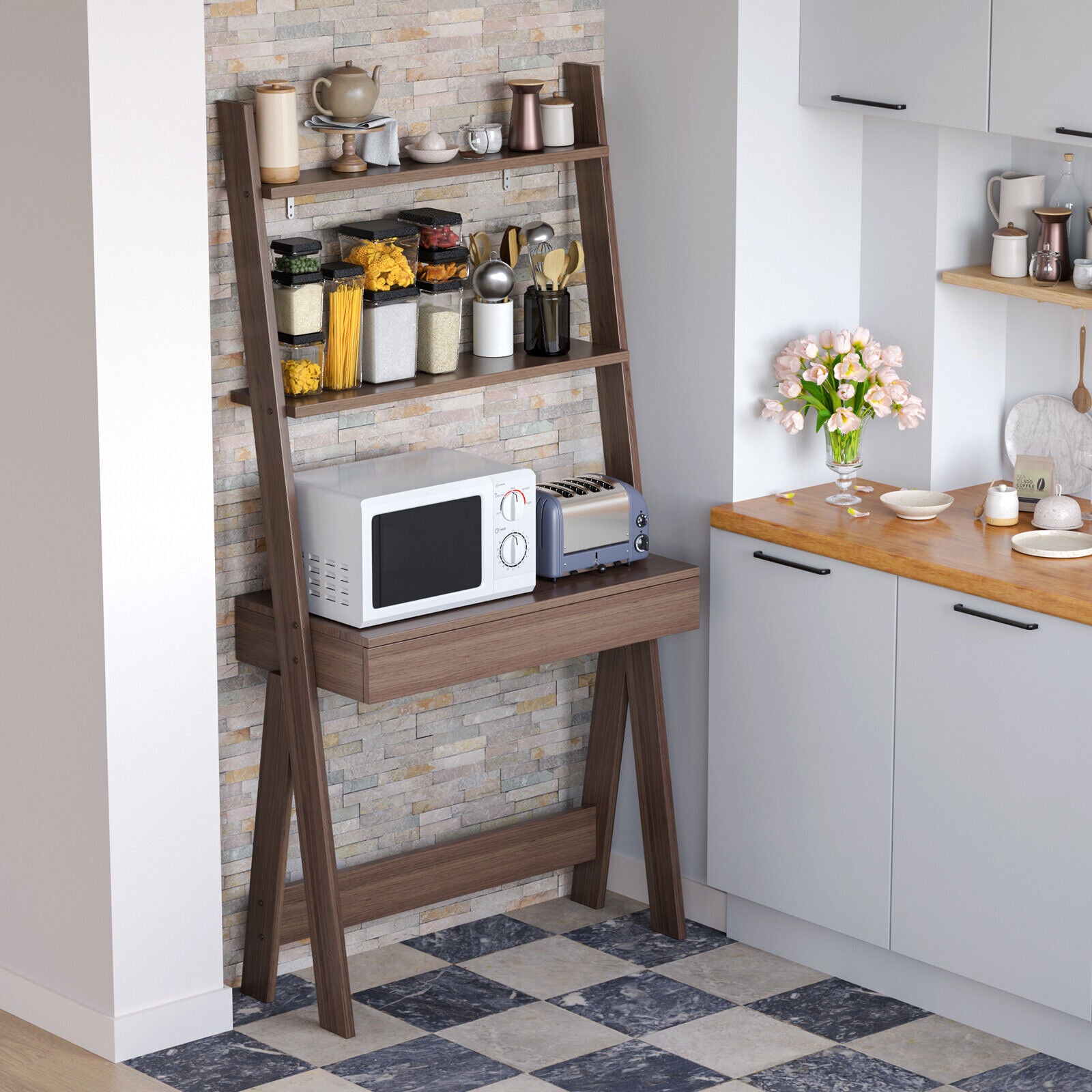 This ladder shelf features a 2-tier bookshelf a wide countertop and a large drawer where you can store plenty of items such as books photos plants tableware laptop and more. Since it is made of P2 MDF this ladder shelf presents excellent sturdiness and durability. You can place it in a corner without taking up much space. Besides we also provide you with an anti-toppling kit to help fix the ladder shelf firmly to the wall. It is applicable to the living room bedroom kitchen study and more occasions. Without any difficult installation you can quickly get the 33" x 15.5" x 65" ladder shelf.