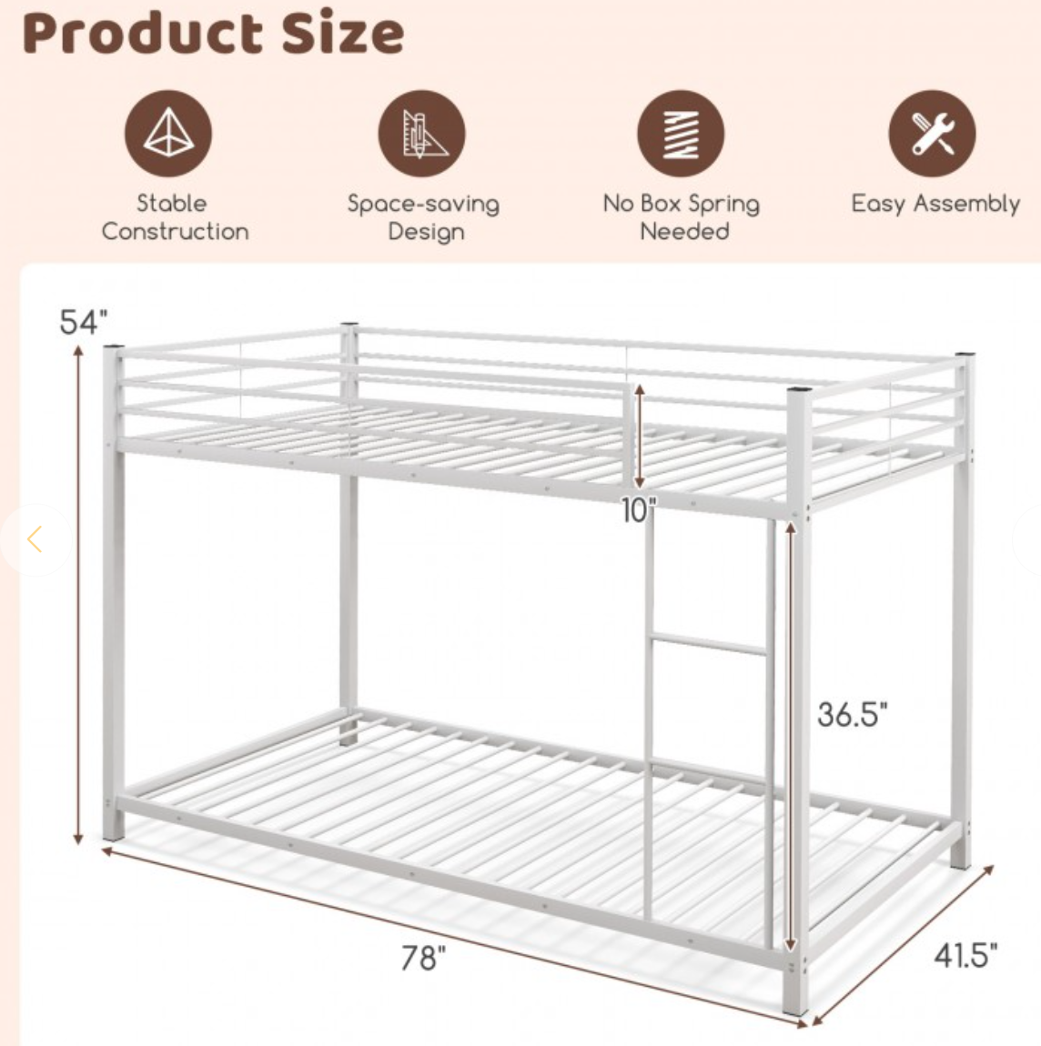 ● No Box Spring Needed: The reliable slats are designed to support and extend the life of the mattress. It can accommodate a standard twin-size mattress (not included) directly, without the need for a box spring. Note: The mattress surface of the upper bed must be 5" below the top edge of the guardrail.