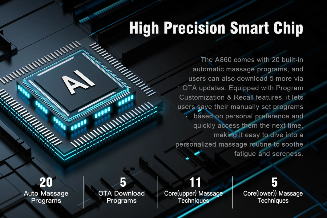 Multiple automatic programs and manual customizations for kneading, tapping, shiatsu, rolling, stretching and more