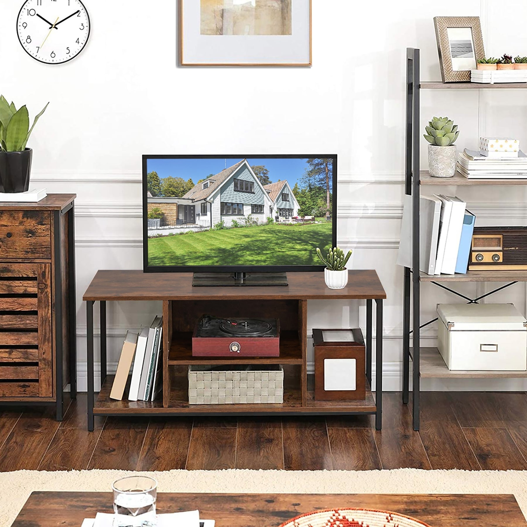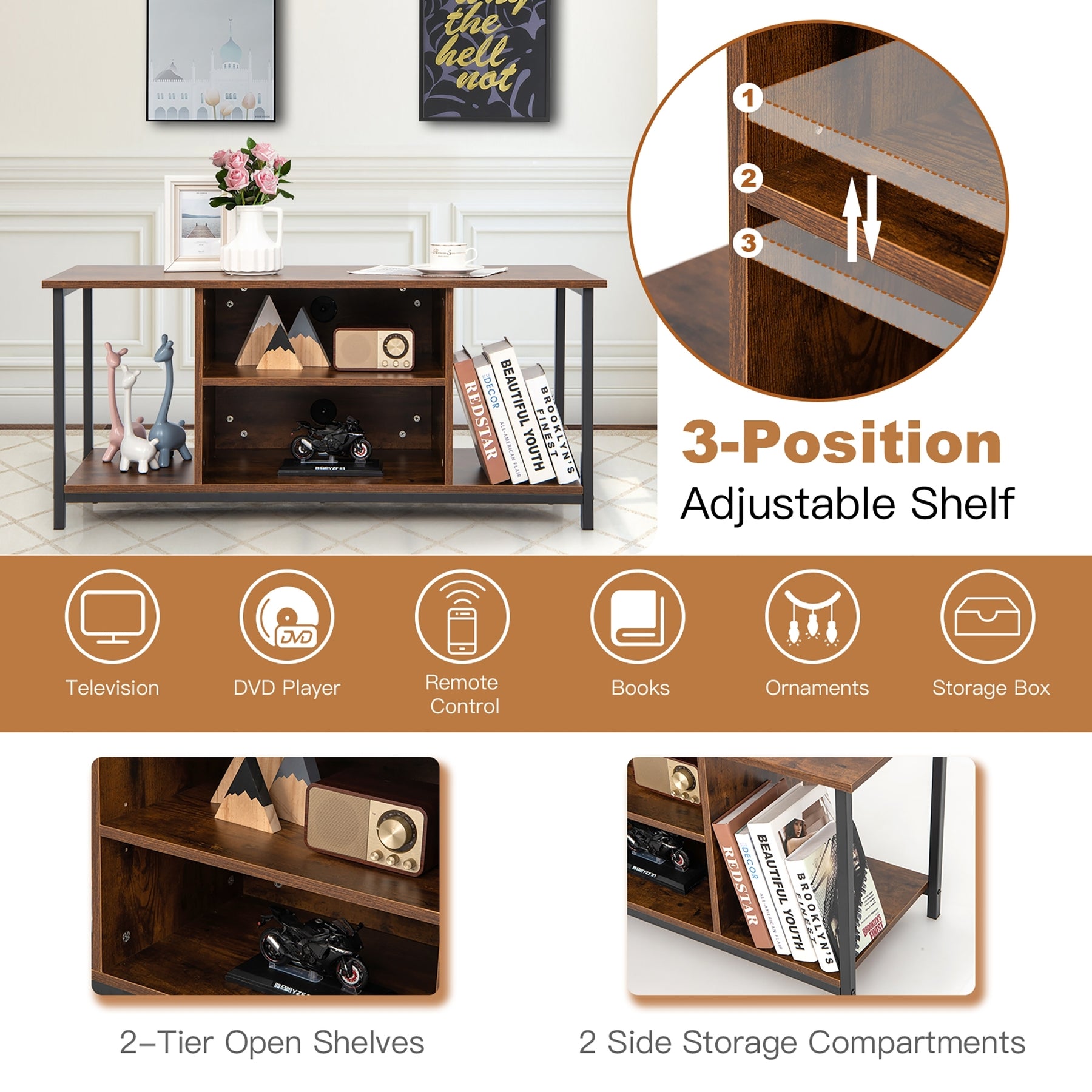 This TV console is mainly made of durable engineered wood and supported by sturdy steel pipes which ensures long-lasting service life and reliable loading capacity. The spacious tabletop is compatible with most flat screen TVs up to 50''. The 2-tier shelf and 2 side compartments are both deep and wide enough to hold plenty of media devices books and other items. What's more the 3-position adjustable shelf offers flexible storage space.