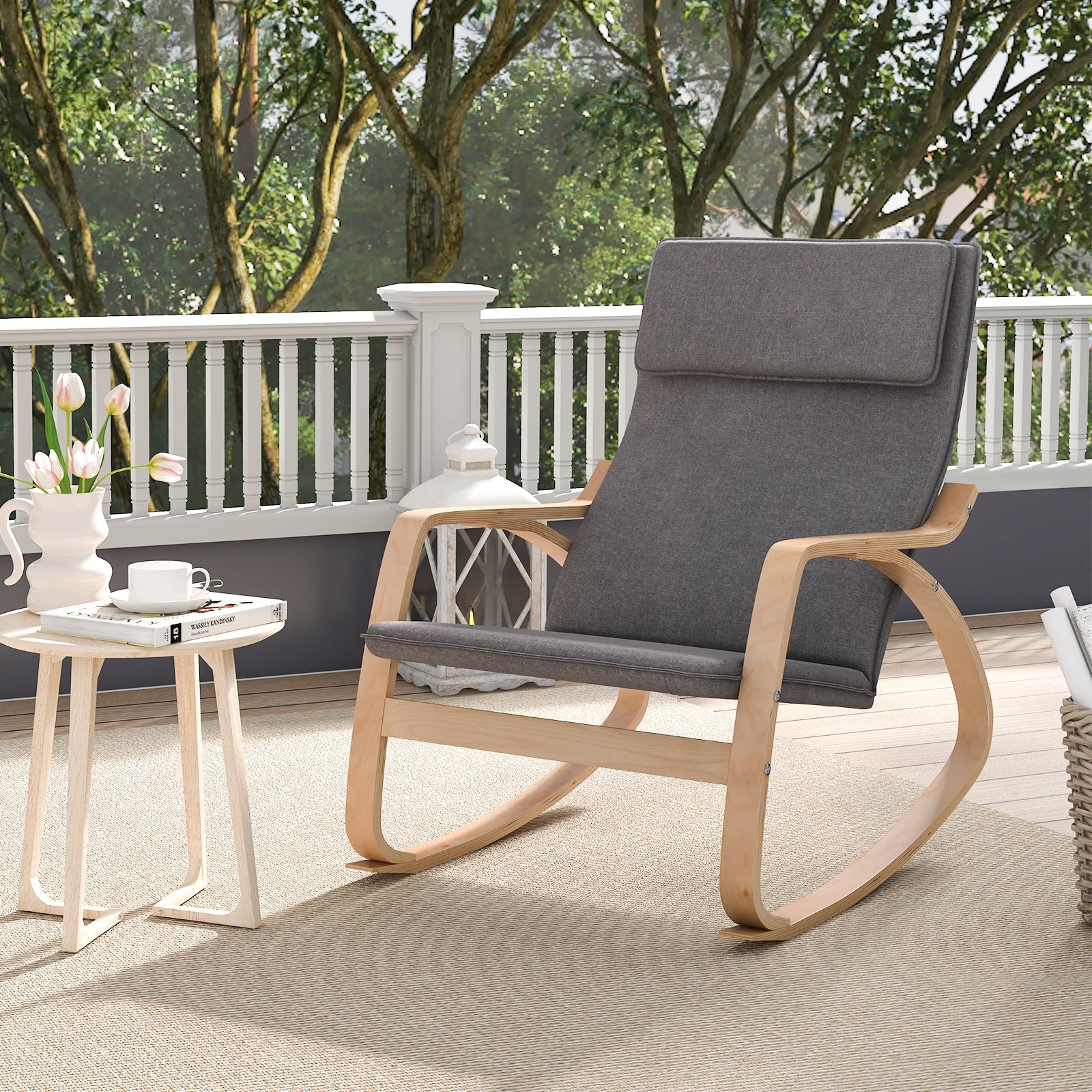 Covered by imitation linen fabric and constructed by steel and birch laminate this single chair is comfortable durable and stable. You will sit comfortably and feel relax with a 2” cushioned seat and curved armrests. The specially designed arc base with perfect angle can effectively help you relax your body thus you will have a super smooth and comfortable rocking experience. A high-quality wood frame ensures long-term service so that the ergonomic bentwood rocking chair is strong enough to withstand the weight of 330 LBS.