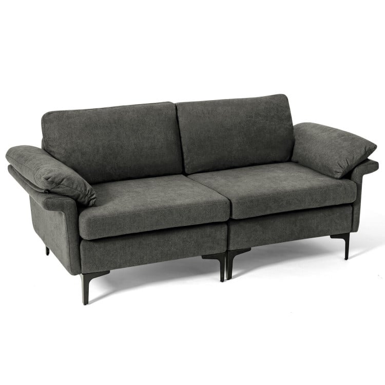 ● Compact loveseat sofa with soft cushions and pillows provides cozy seating for two.