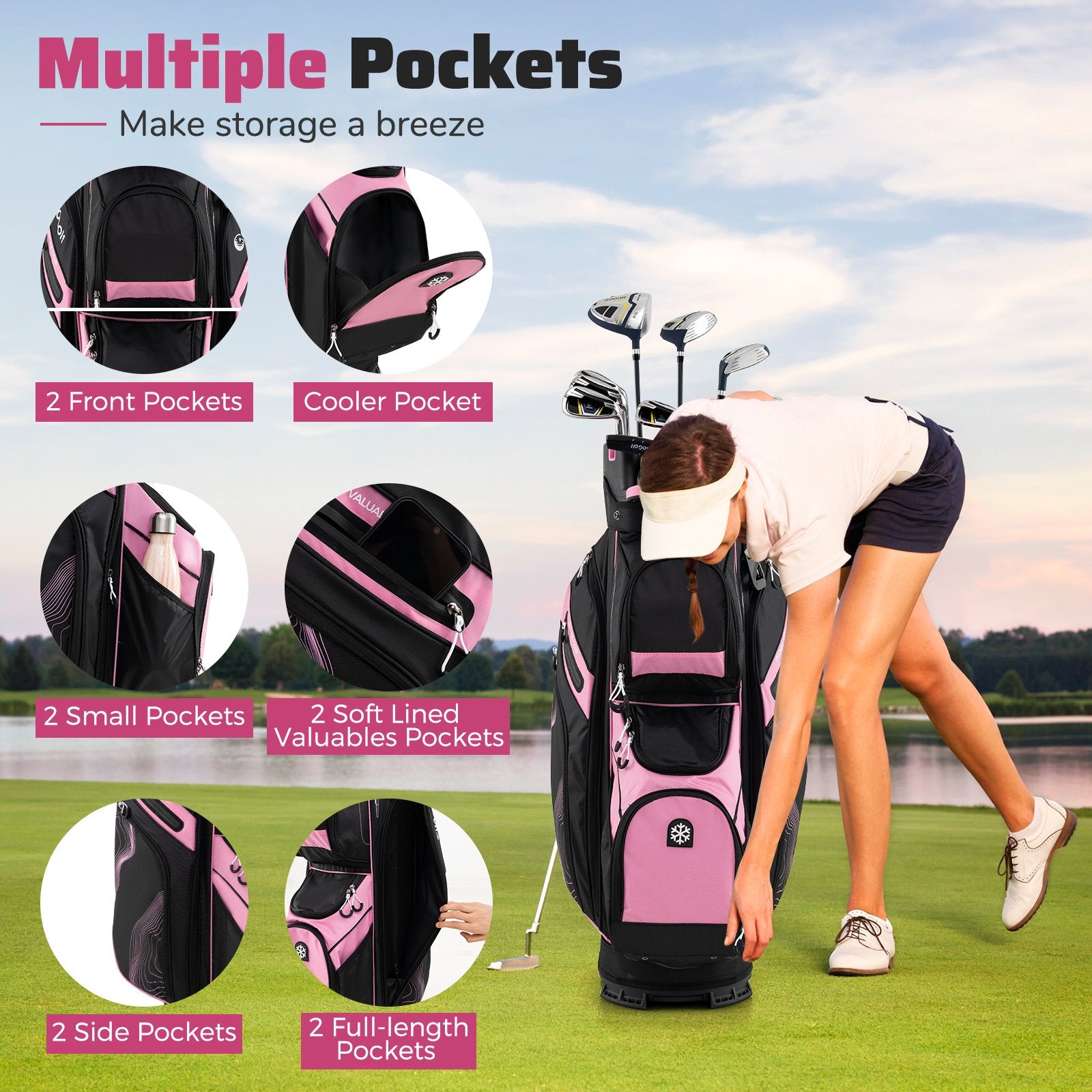 Sufficient Storage Space: This golf bag offers ample storage with a total of 11 pockets including 2 front pockets a cooler pocket 2 small pockets 2 soft-lined valuables pockets 2 side pockets and 2 full-length pockets. It keeps all your essentials organized and easily accessible.