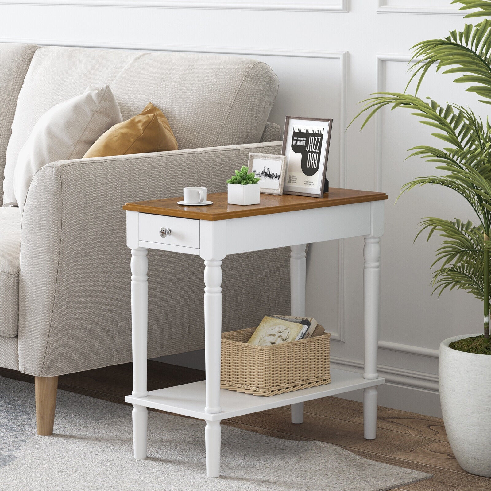 ● Stable and Durable Construction: This slim side table is constructed from high-class MDF boards solid rubber wood and acacia wood which are not easy to deform and long lasting. And the 4 sturdy table legs also make this compact end table stable enough on the ground.