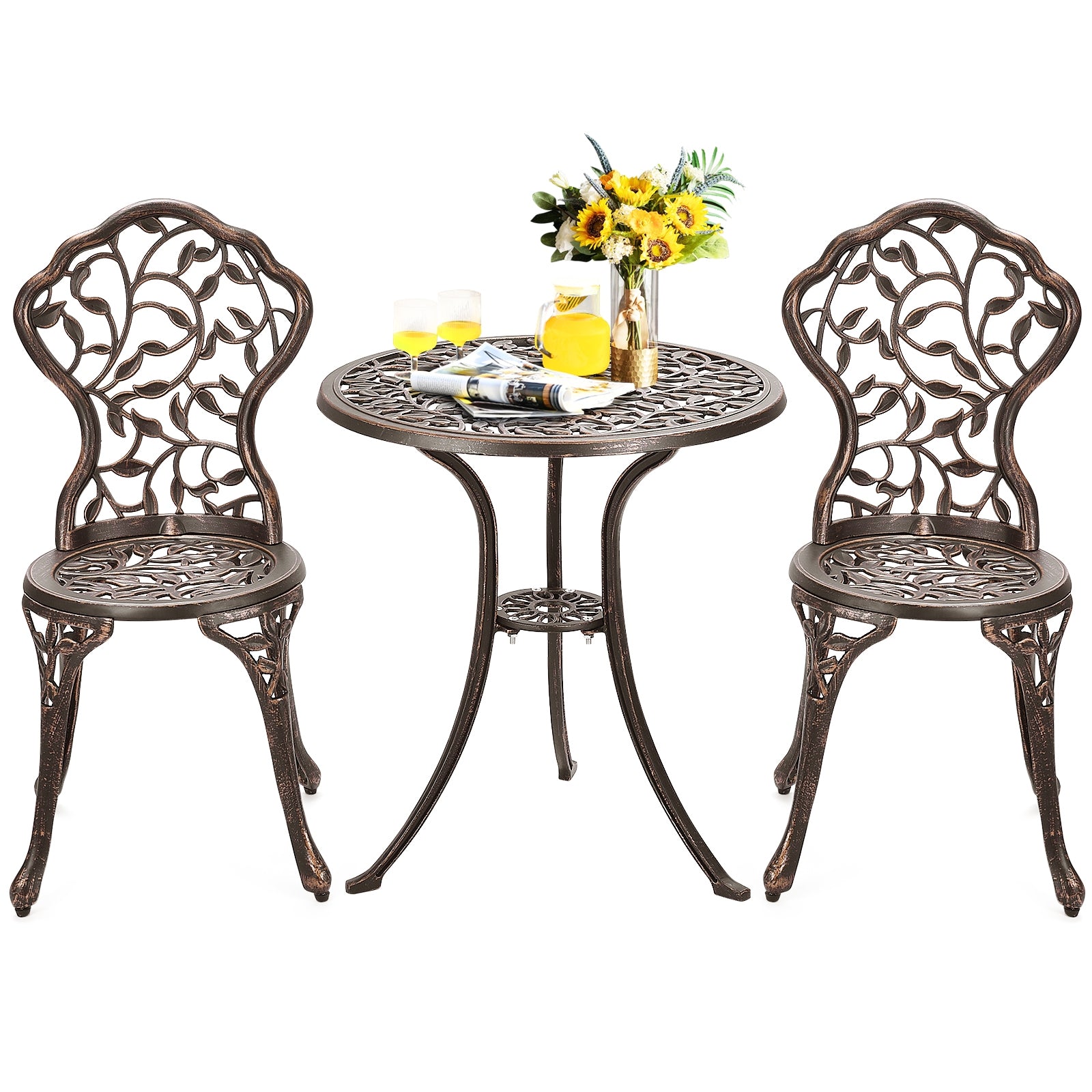 Made of cast aluminum the bistro set is strong and durable. It features an attractive leaf design in an antique copper finish. Simple yet elegant this bistro set is great for outdoor brunches or an afternoon tea on your front porch or any outdoor area.