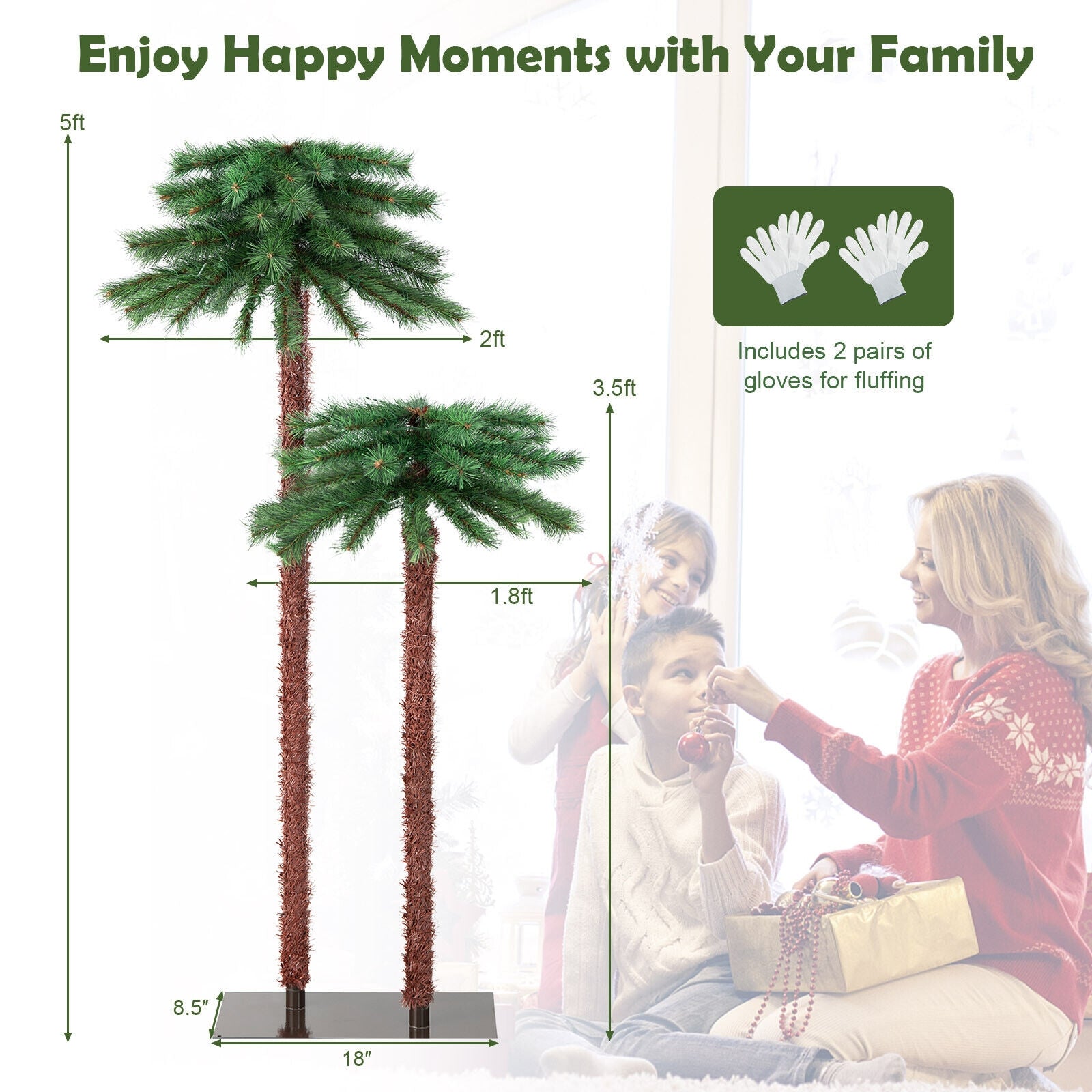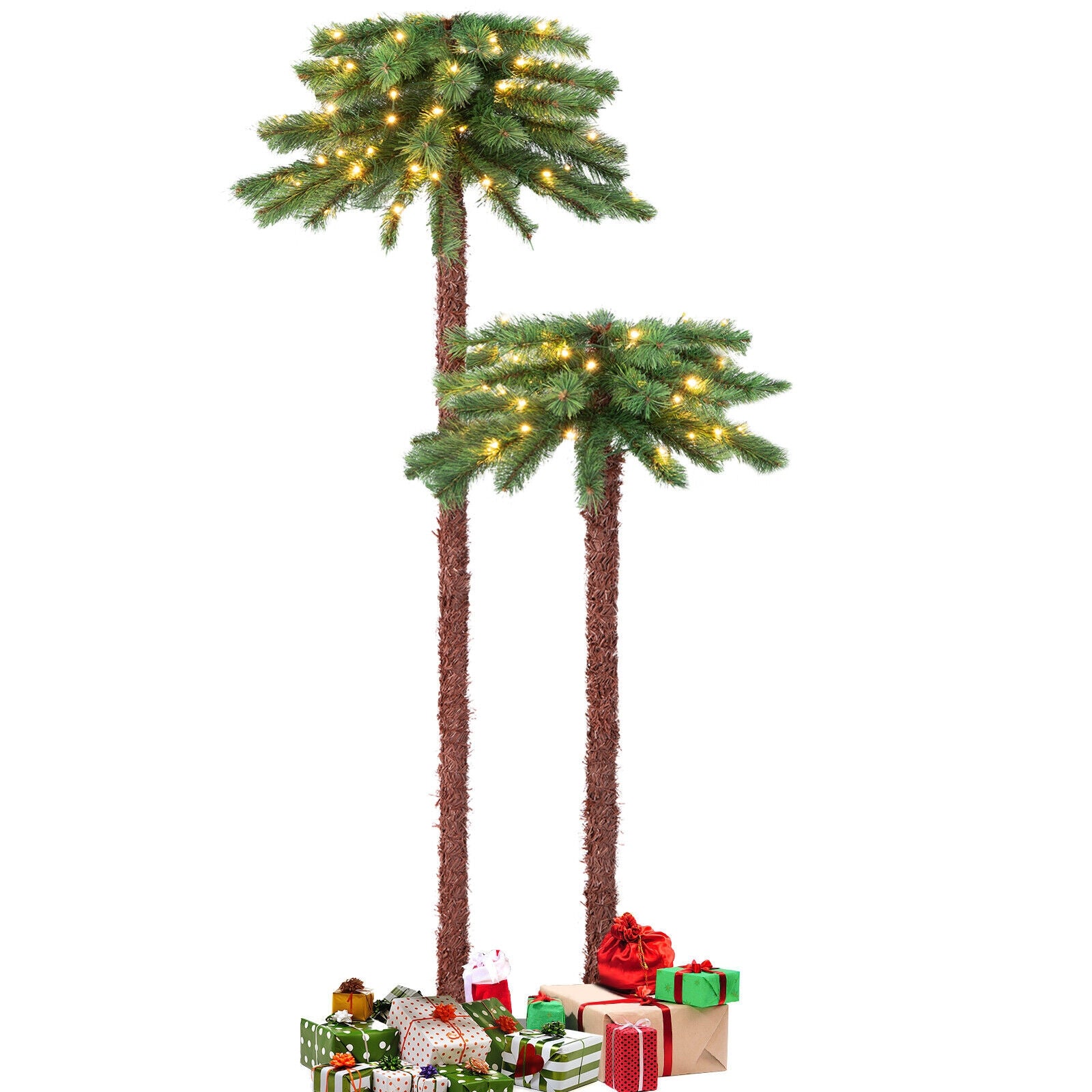 This double-trunk artificial Christmas palm tree includes 2 trees of different heights (3.5 ft and 5 ft) which provide more space for hanging ornaments. And thanks to the palm tree shape you can put more gifts on the bottom and it would not take up much floor space. Besides it is pre-strung with 100 warm-white LED lights and there is no need to purchase additional light strips. The leaves are made of premium pine needles which are flame-retardant crack-resistant and fade-resistant ensuring long service life. In addition when not in use the tree can be easily separated into 6 sections (each tree has 3 sections) and a metal stand which would not take up much space for storage. We also provide 2 pairs of gloves for protecting your hands from hurting when installing the tree. It could be a perfect decoration at any time of the year.