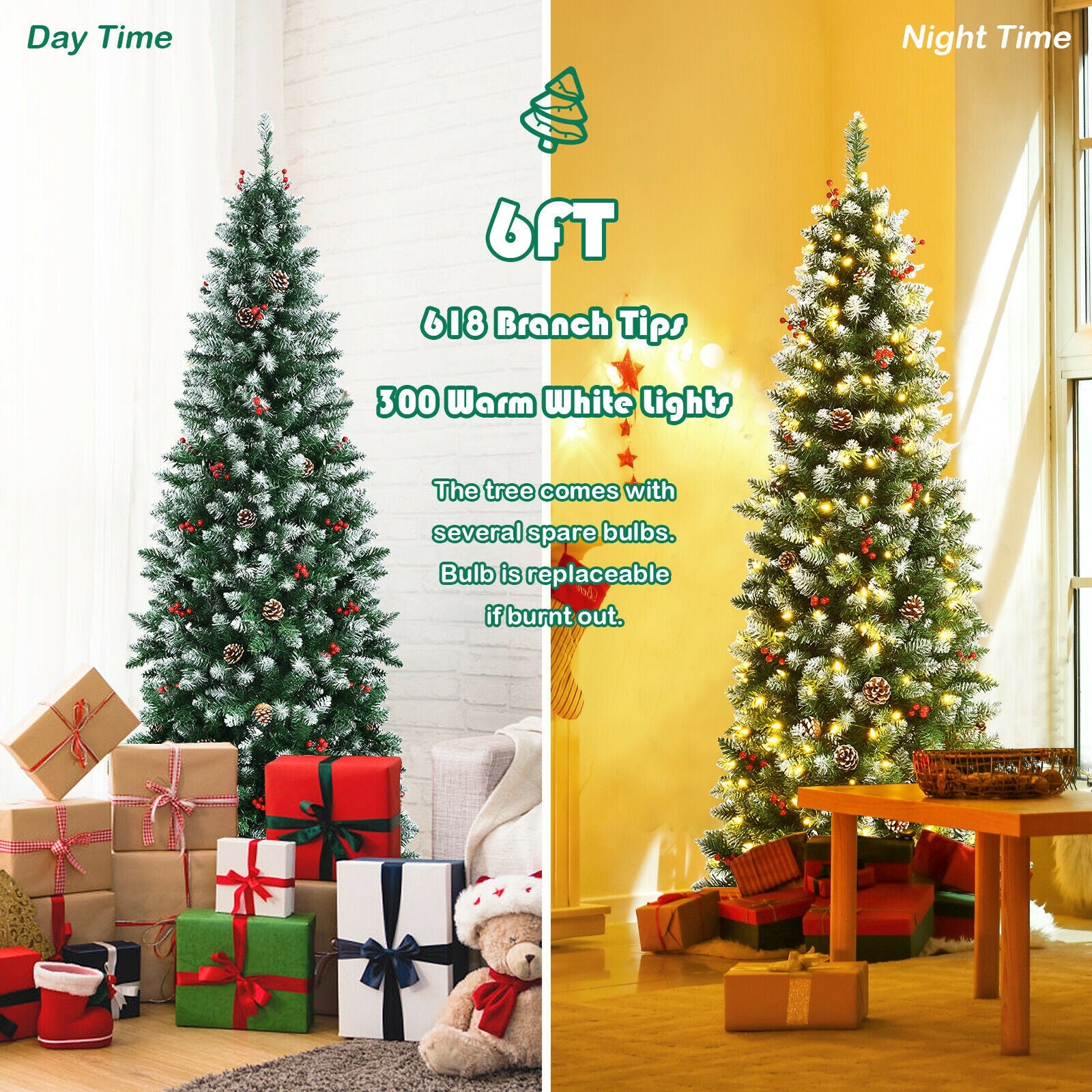 ● Realistic and Dense Branch Tips: With 408 branch tips this pencil Christmas tree looks lush and full from near and far highly restoring the appearance of a real tree. There are lots of pine cones and red berry clusters decorated among the branches making it more vivid and attractive. All tips are sprayed with snow to create a feeling of winter in your house.