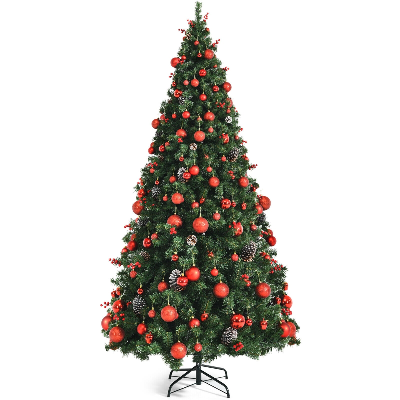 This artificial Xmas tree comes with 111/160/212 pieces of ornaments including snowy pine cones red berries bright balls glittery balls matte balls and red apples. All these accessories endow the tree with super charms. You can hang them up according to your inspirations on the lush tree body. In addition 150/250/350 LED lights will glitter warm white lights in the darkness making a warm and romantic atmosphere for you. With a robust metal stand the Xmas tree will stand in firmness all the Christmas season. Moreover hinged branches and separated sections make convenience for tree setup that save your energy and time.