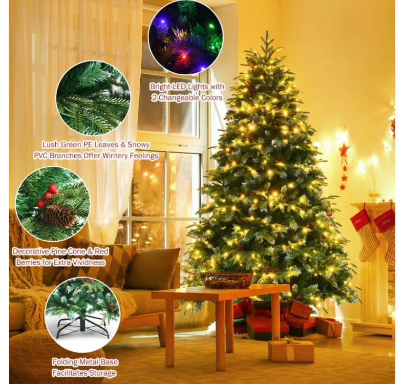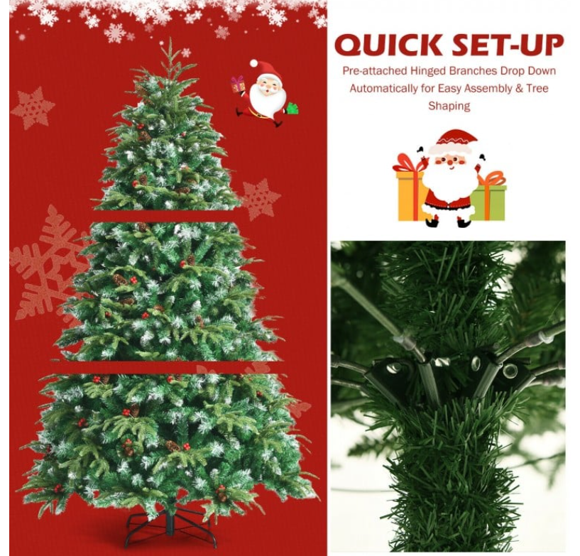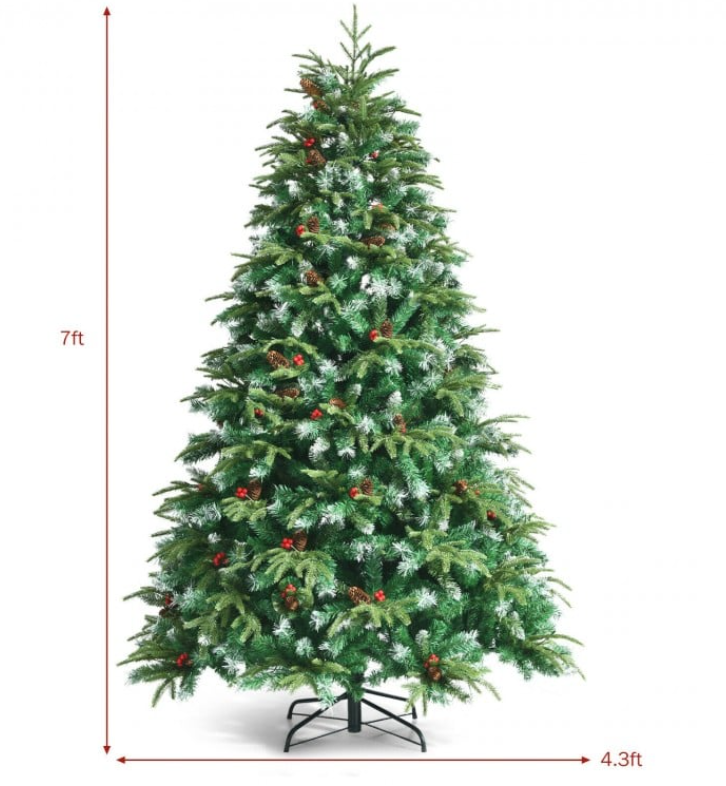 ● Various Ornaments Add Natural Beauty: Combines with numerous plump pine cones and polished red berry clusters, this artificial pine tree has a real and natural looking. 1315 /2599 branch tips with snowy design create a lifelike full-bodied tree in winter scenes.