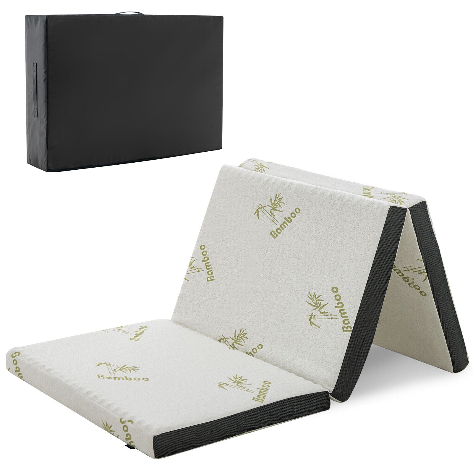 Designed with 3 layers all-foam system the 3-inch folding mattress will give you quiet and deep sleep experience.The soft and breathable bamboo top layer regulates body temperature for cool night’s sleep. Additionally high quality fiberglass is characterized by fire retardance and long-lasting durability. This mattress helps to relieve pain and reduce pressure points which make you feel refreshed and energized. More you can unfolding the mattress fold 1 or 2 sections and lean the rest against the wall to be used as a portable bed lounger sofa and extra seat. In addition the carrying bag brings much convenience to transport and store making it ideal for indoor and outdoor activities including RV's camping and yoga etc.