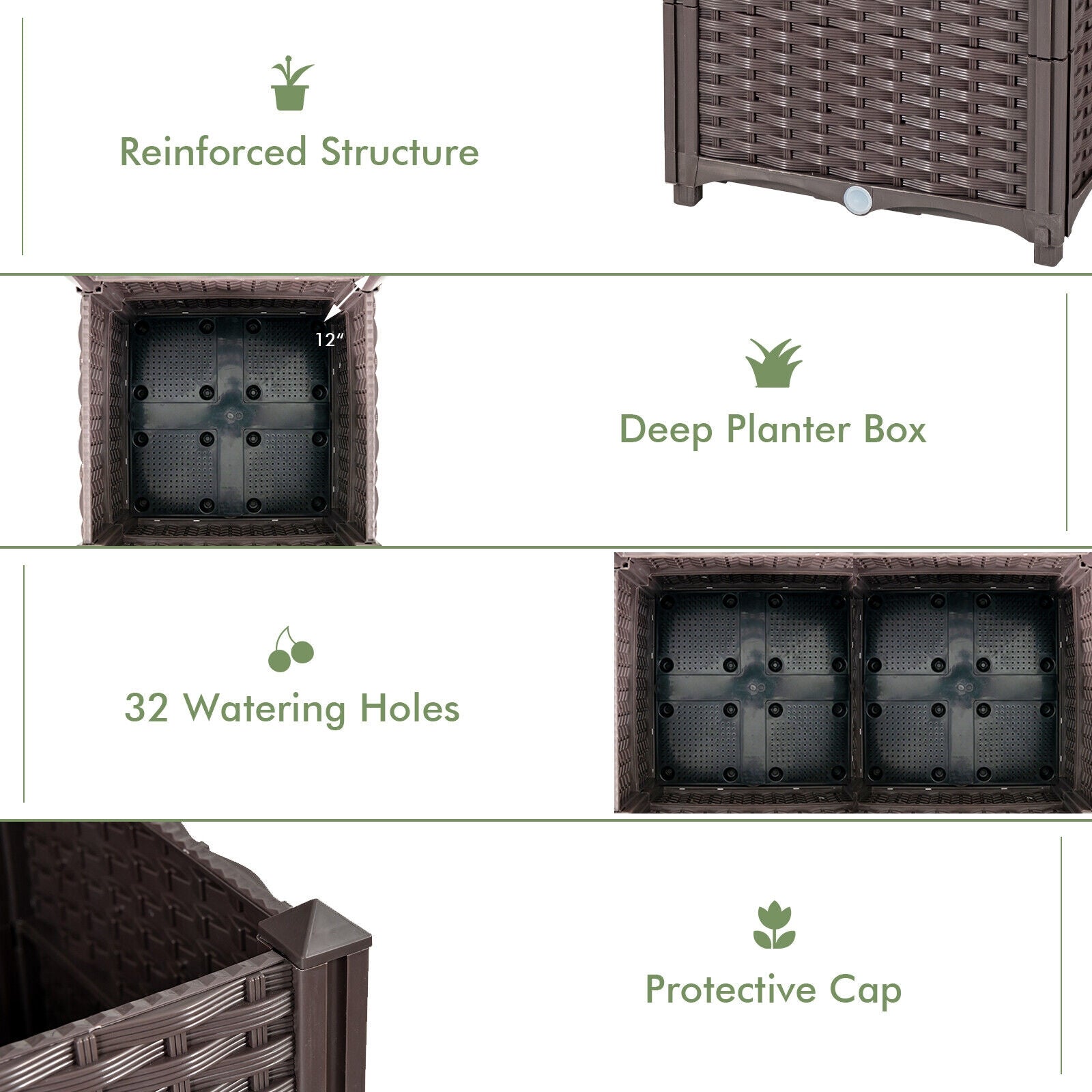 ● Premium PE Material and Rattan Style:  Made of reinforced PE materials  the outdoor free-standing garden bed is characterized by great weather resistance  sun protection  and excellent durability  which can be the best partner for your garden. Besides  the dark-brown rattan-style appearance can perfectly match the trim on your garden.