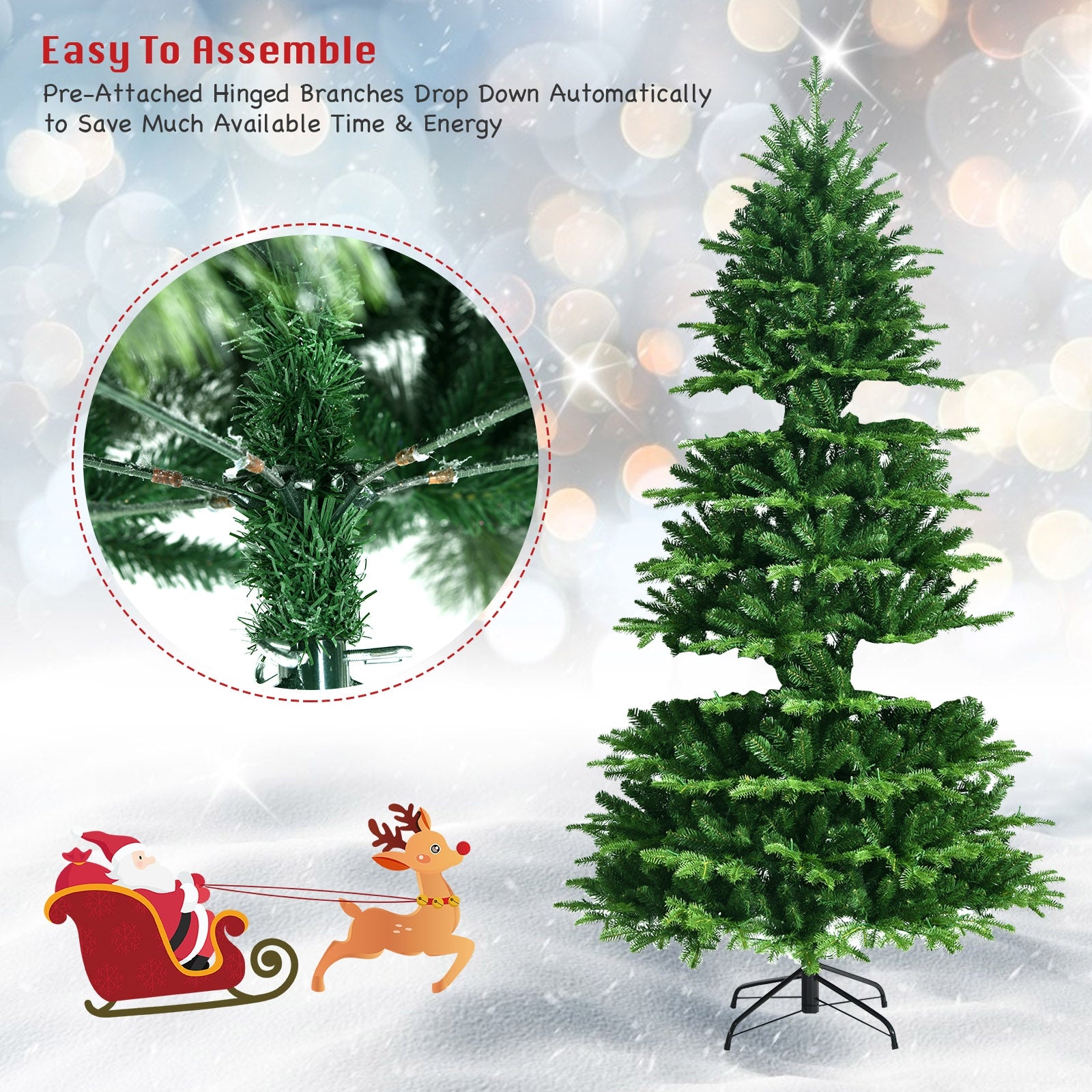 ● Quick Assembly and Easy Fluffing: Thanks to the hinged structure you can assemble the tree quickly by inserting sections in order. All branches will drop automatically and you just need to organize the leaves so as to get a fully fluffed tree shape. Besides the folding metal stand supports trees uprightly and facilitates storage when the Christmas season is over.