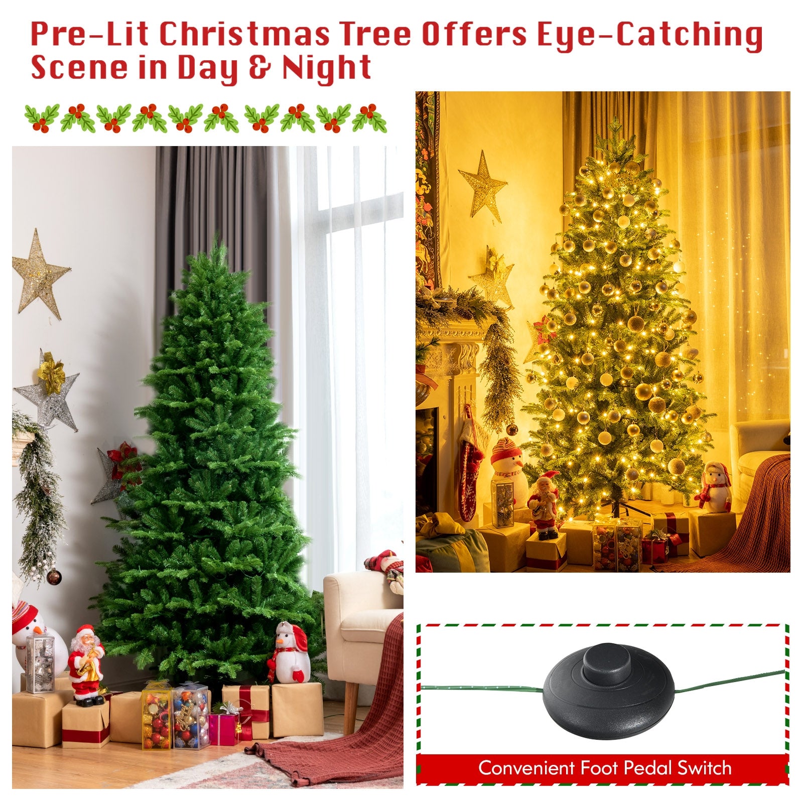 ● Shining Lights Are Blazed in Every Corner: The eye-catching Christmas tree comes with 450/620 pre-strung LED lights illuminating the home with bright and warm lighting. Especially at night the shiny tree allows you to immerse in the joy of the holiday. Combines with a convenient pedal switch you can turn lights on and off easily.