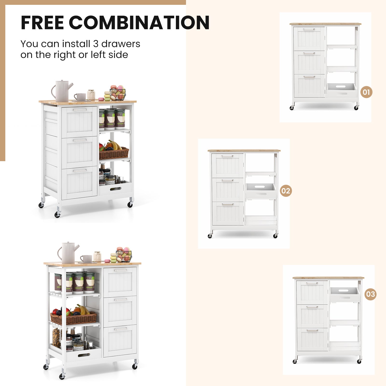 Made of rubber wood and pine this kitchen cart is extremely sturdy and wear-resistant. NC paint makes a smooth surface for durability without pungent smell. It features 3 large drawers 2 open shelves and 1 removable tray to provide ample space for storing kitchen supplies. Equipped with 4 universal casters (2 with brakes) it achieves a perfect balance between convenient mobility and high security. With modern and refined style the kitchen cart is suitable for kitchen bar restaurant and more.