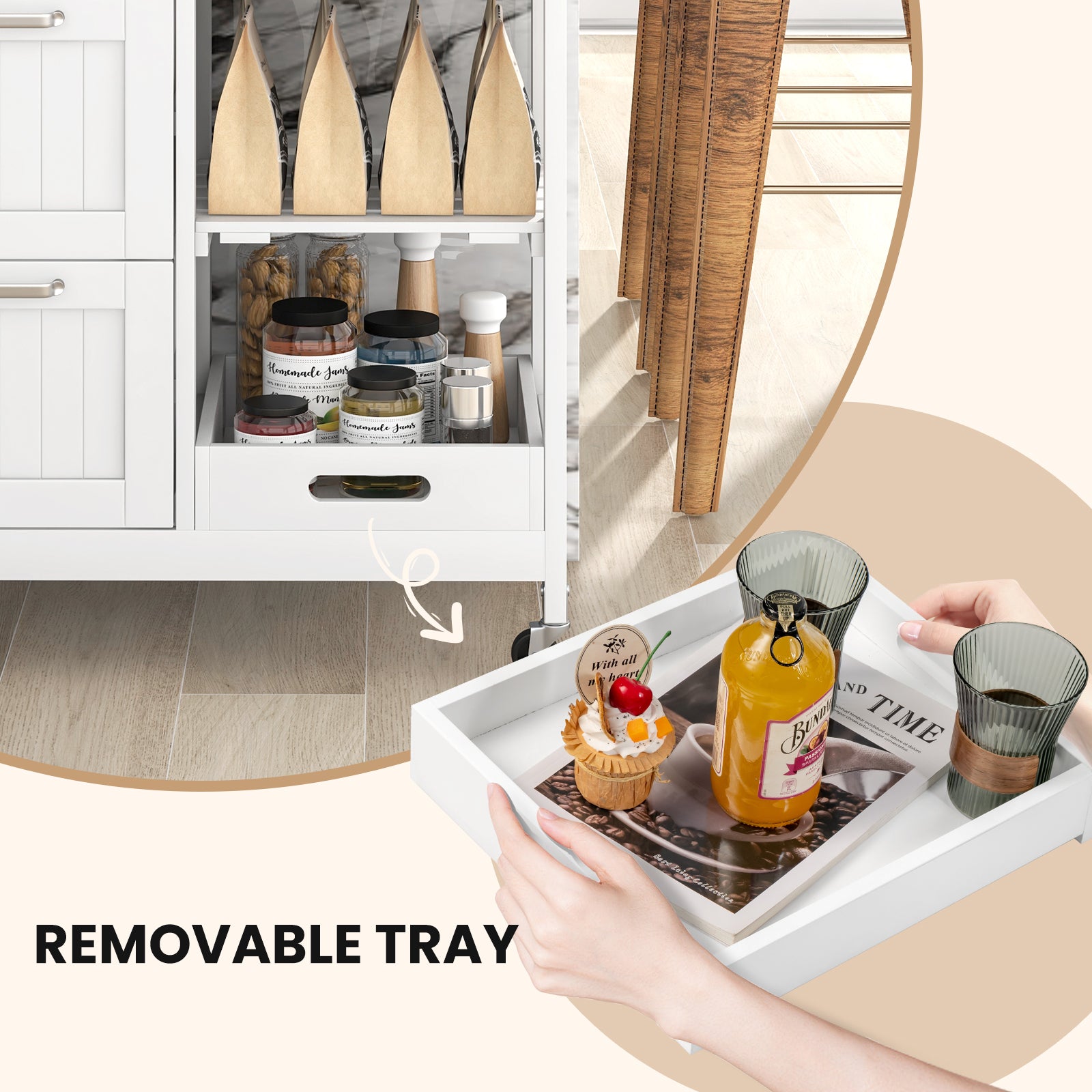 ● Wide Application: This rolling trolley is widely used as a kitchen cart storage cabinet or entryway console table. With simple and elegant appearance it can perfectly blend into any décor. The cart is ideal for kitchen hallway restaurant or anywhere you need more extra storage.