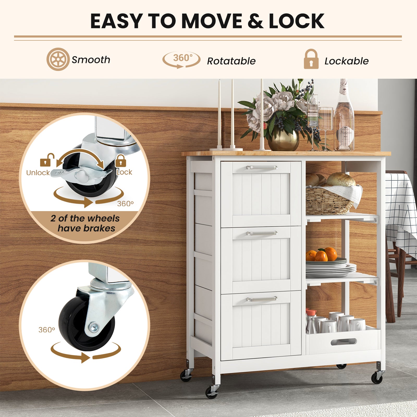 ● 360° Swivel Casters for Free Mobility: Equipped with 4 universal wheels the kitchen island cart can be easily pushed to anywhere you want. Besides 2 of them are lockable with brakes so that you can keep the cart in position ensuring great security and convenience.