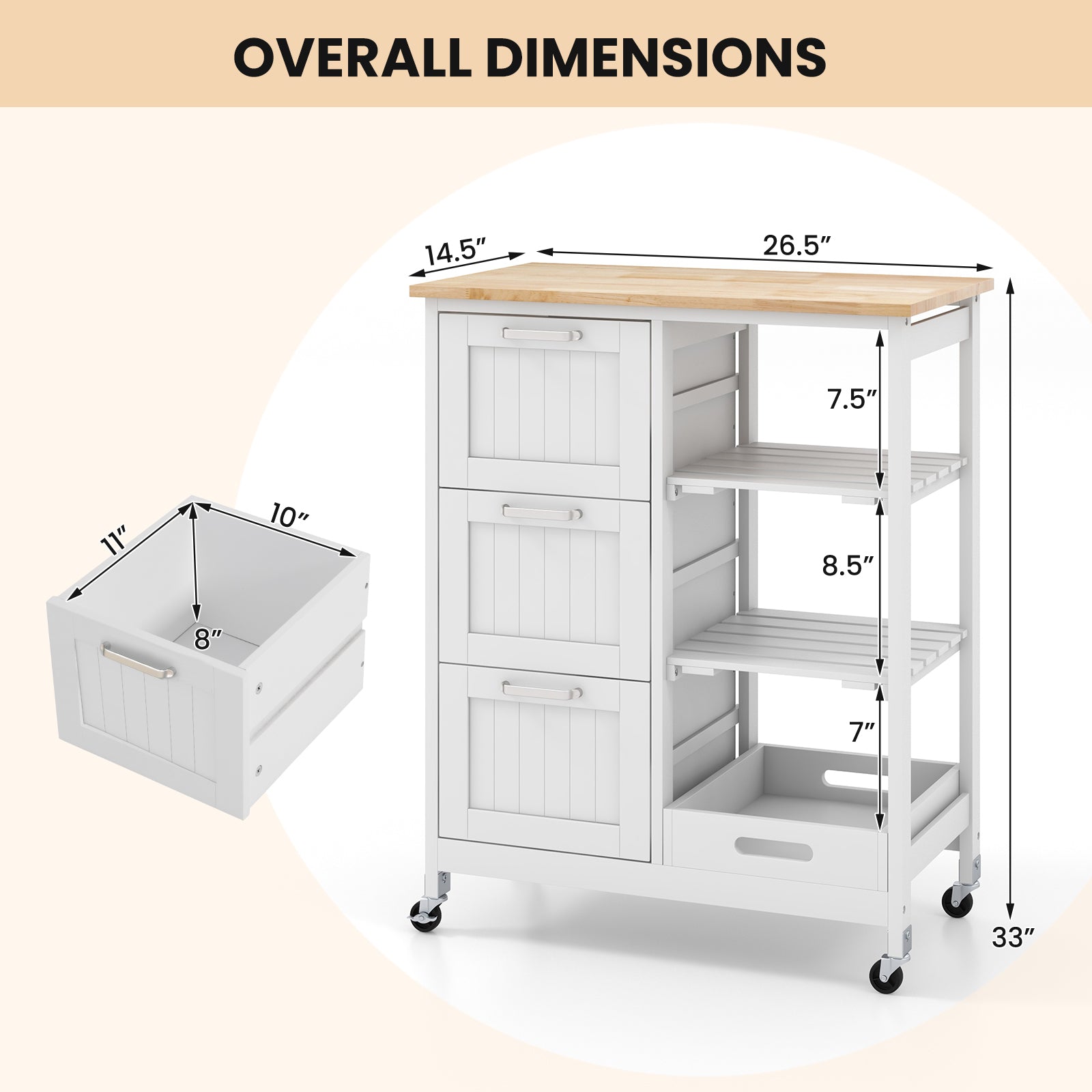 - Overall dimensions: 26.5" x 14.5" x 33" (L x W x H)