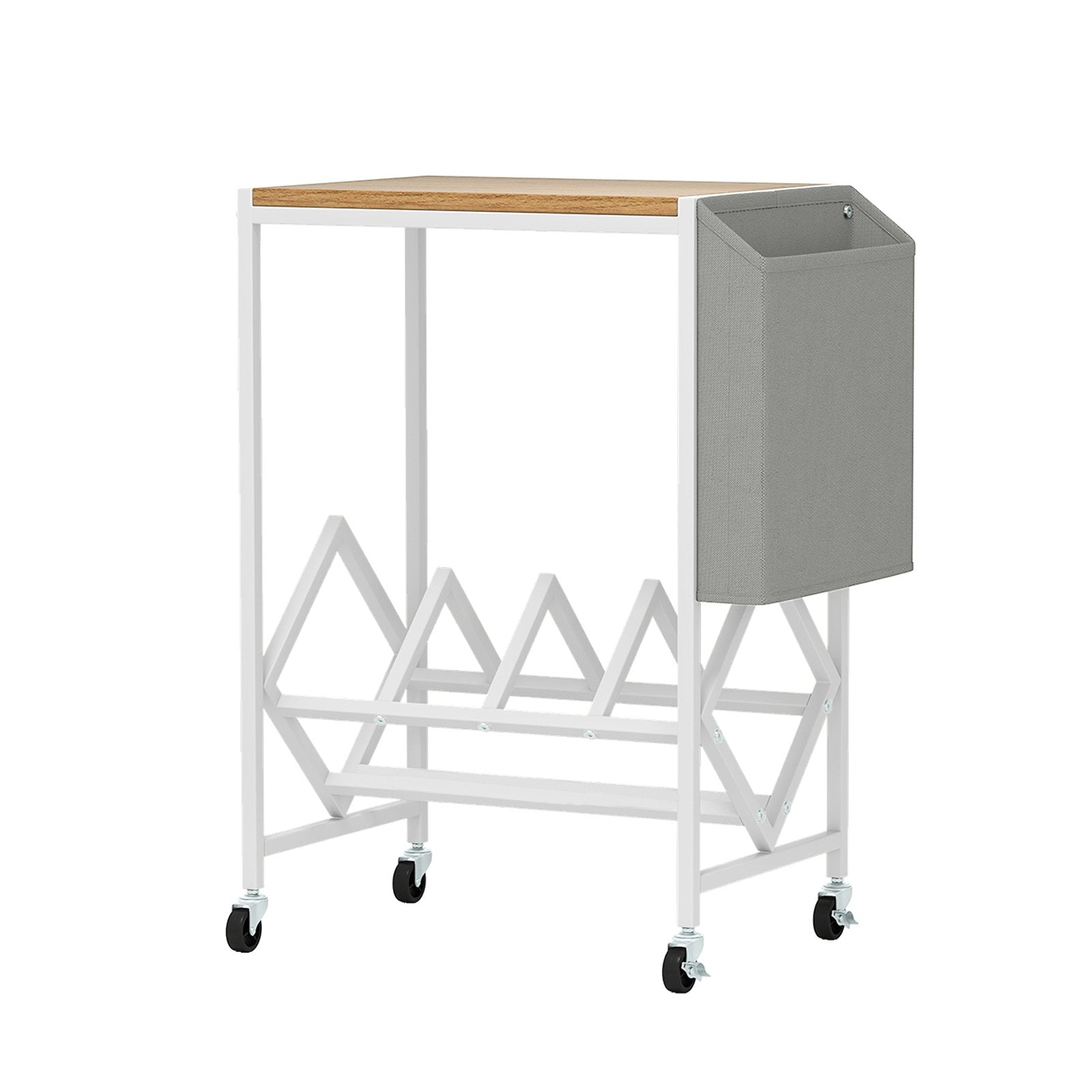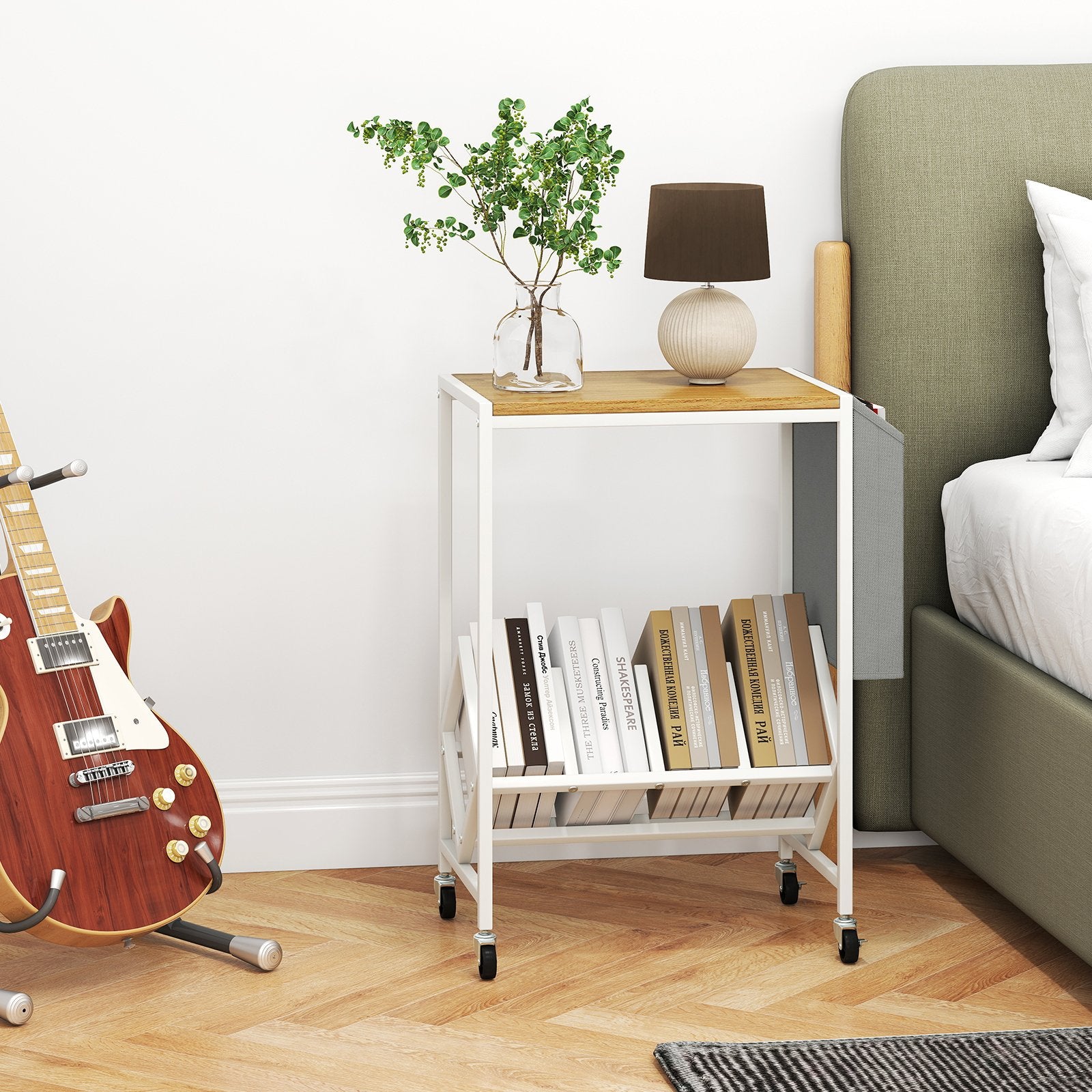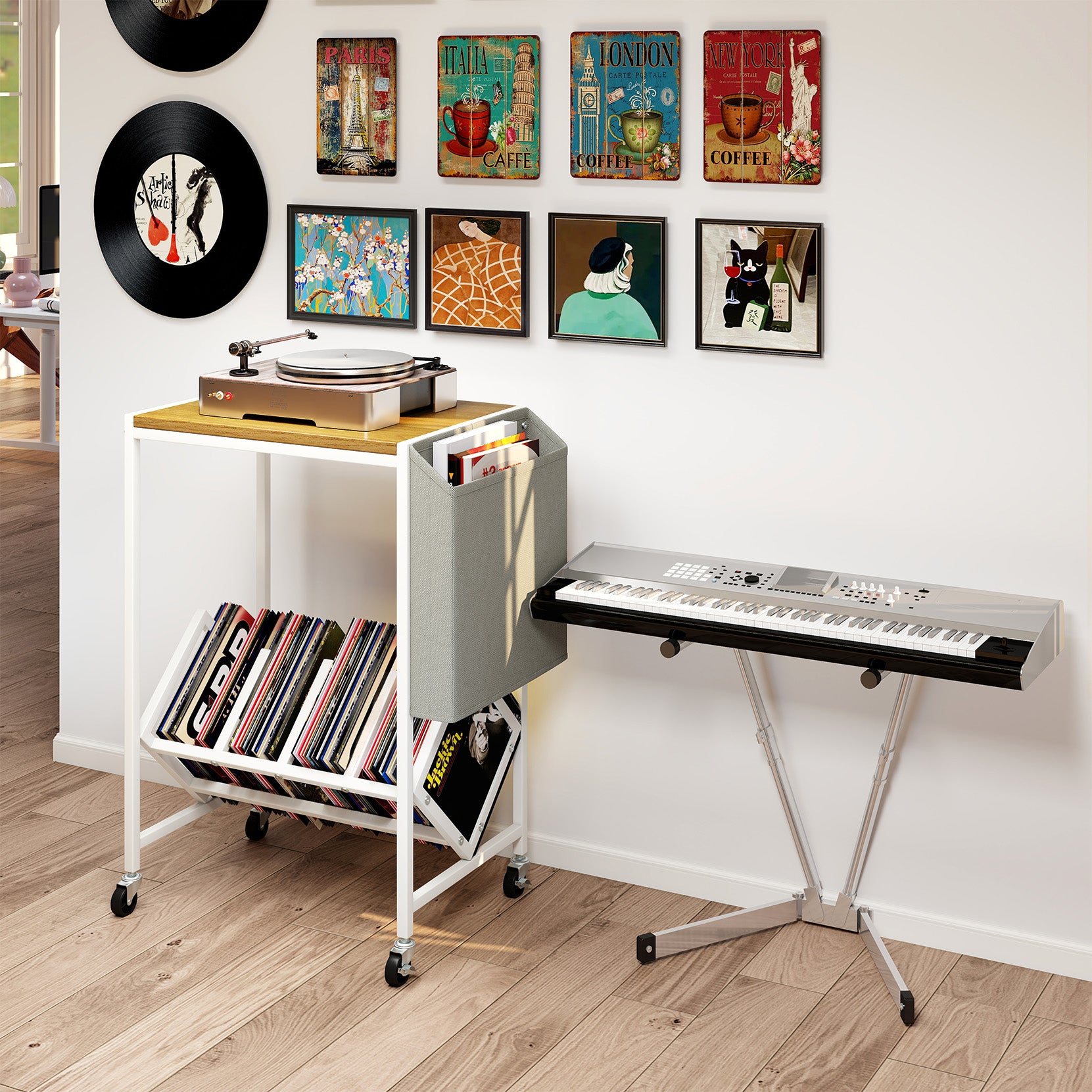 Rolling Record Player Stand 2-Tier with Vinyl Storage and Magazine Holder Bag-Natural