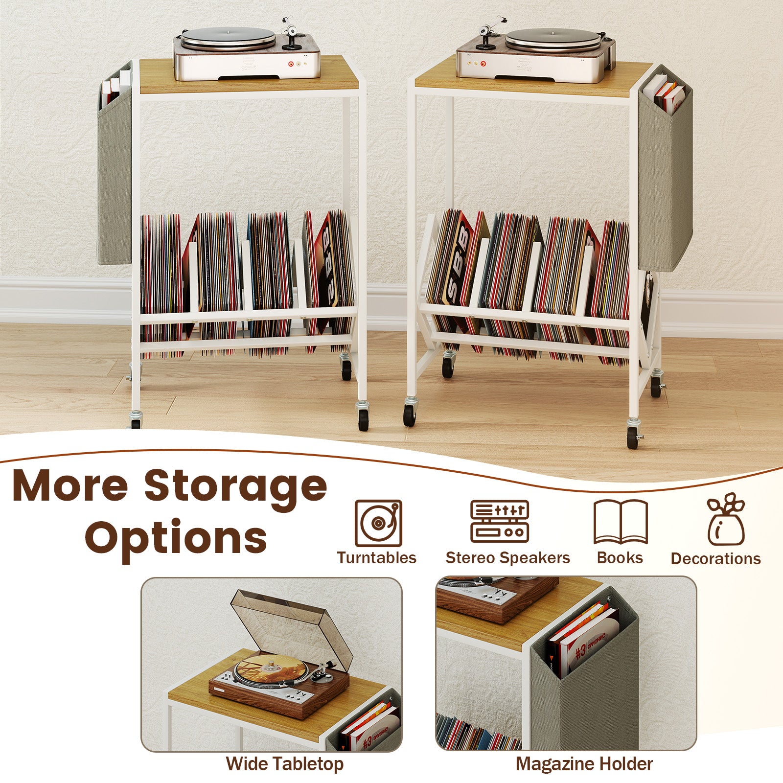 More Storage Options: To enhance audio experience the vinyl record table features a wide tabletop to accommodate turntable with ease. For storage convenience the magazine holder can be installed on either the left or right side based on your needs.