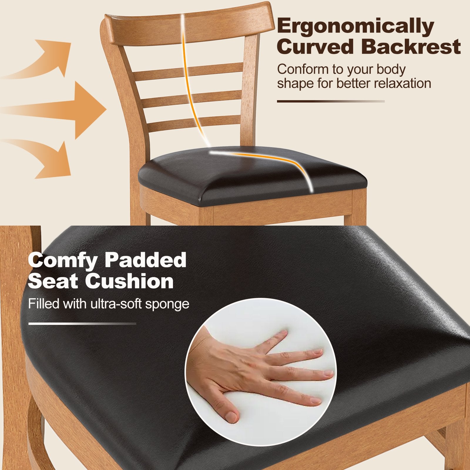 ● Ergonomic Comfort: The kitchen chairs feature comfy padded seat cushions and ergonomically curved backrests designed to support your body's natural posture offering comfort that lasts throughout even the longest dinners.