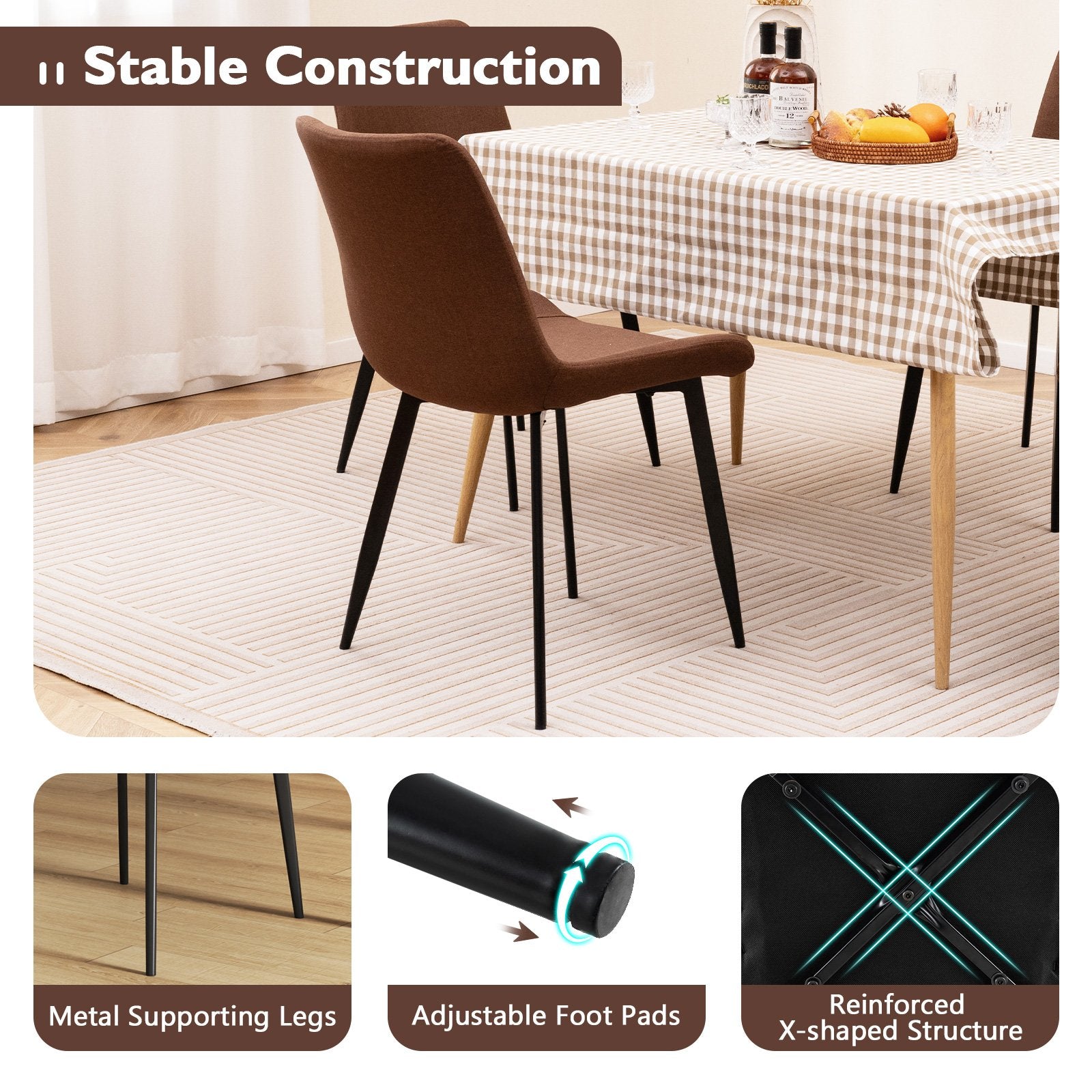 Unwavering Stability: Supported by robust metal legs and reinforced X-shaped structures the armless dining chairs provide a stable seating experience. Moreover the adjustable footpads further enhance stability on various types of floors.
