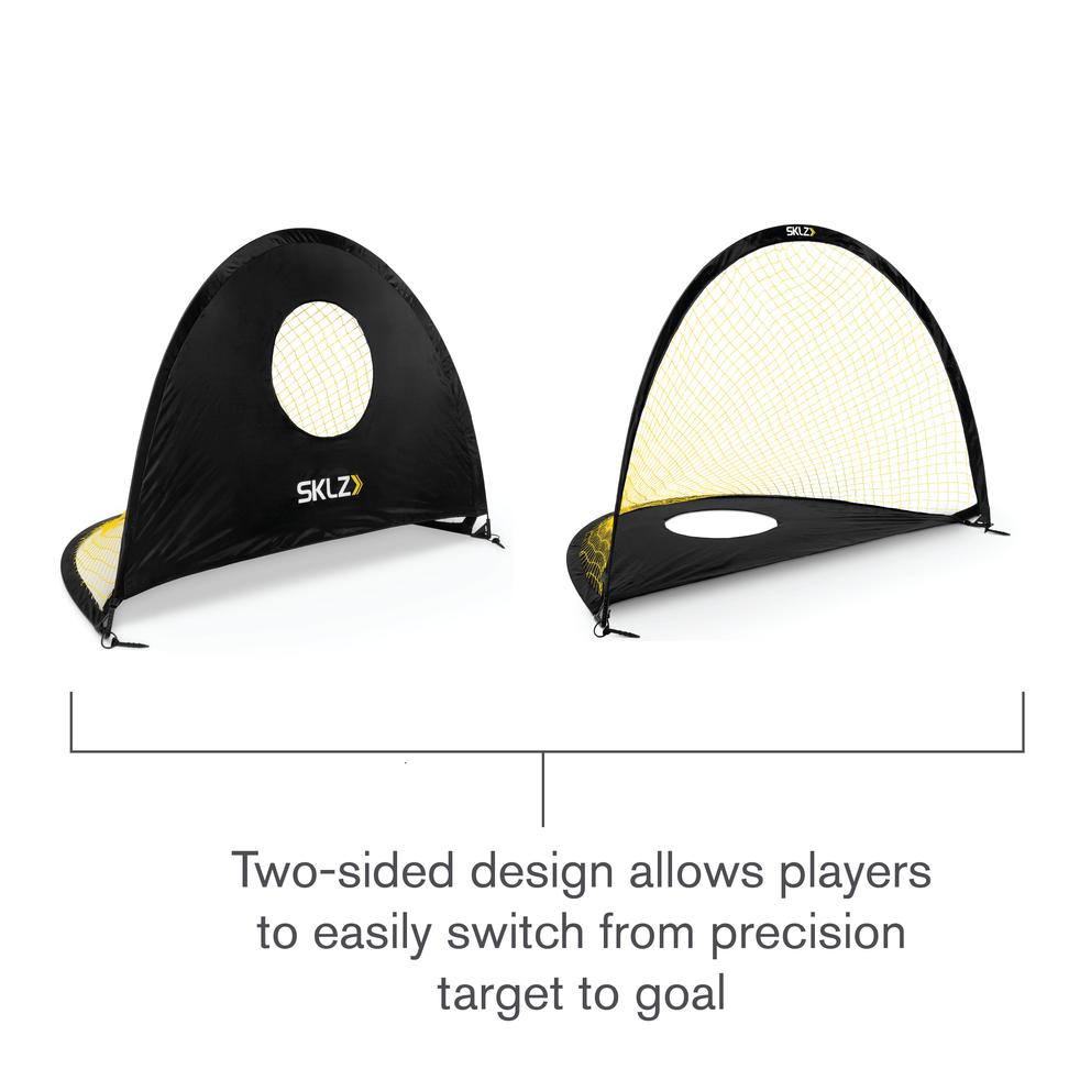 True to its name, the durable two-sided Precision Pop-Up Goal opens in an instant to create a goal on one side and a training target on the other. With attached ground stakes that hold it firm to the grass, the goal stands up to the hardest shots and is perfect for pickup games. Switch to its target side and practice as a team or on your own to build coordination, timing, and technique. The Precision Pop-Up Goal comes with a convenient carry bag and features an easy twist-open frame design so you can quickly set up for a game or training session anywhere. Available in 3’, 4’, and 6’ designs, the Precision Pop-Up Goal gives players of any age or skill level the pickup games and maximum training reps they need. Build the muscle memory, endurance, and ball control needed to improve passing and shooting. The versatile goal is perfect for solo or team training.
