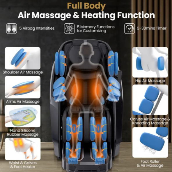 ● Airbag Massage and Heating and Foot Rollers: The 54 airbags are located on the shoulders, arms, calves, and feet to provide pressure massage. Hand silicone rubber massage and waist and calves and feet heating function relieve your soreness. Moreover, the foot rollers stimulate the acupoints deeply for further relaxation.