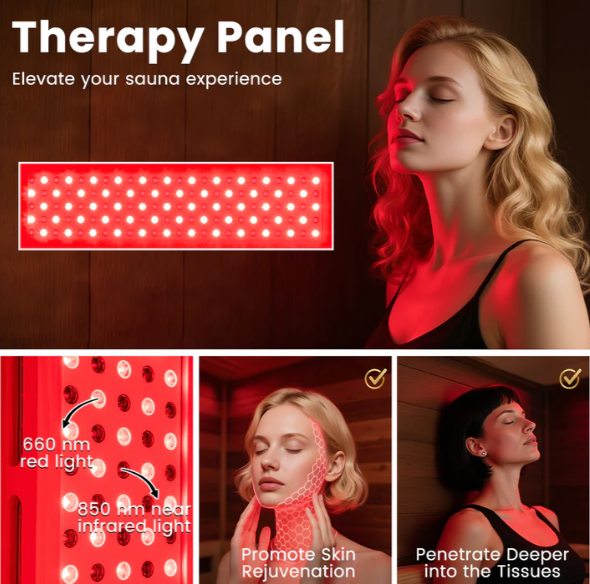- Built-in therapy panel with 660 nm red light and 850 nm near-infrared light for skin rejuvenation, tissue repair, and faster recovery.