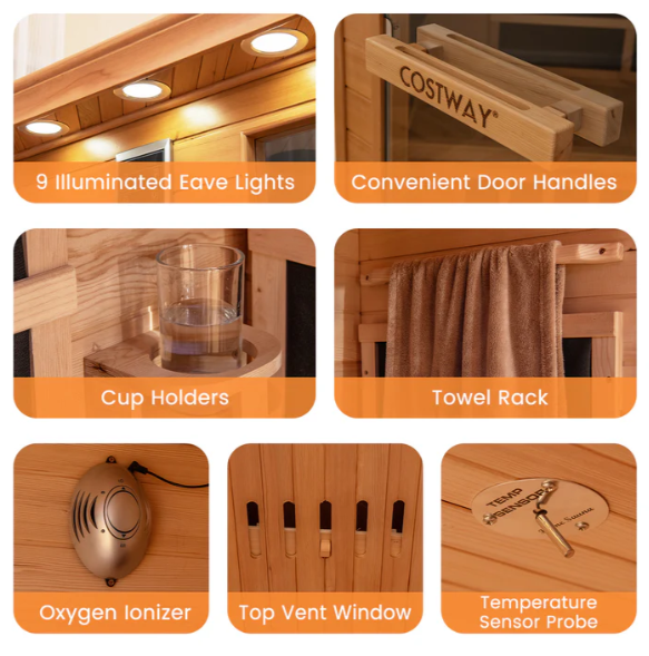 - Material: Canadian Hemlock, Tempered Glass, Mica & Carbon Heaters