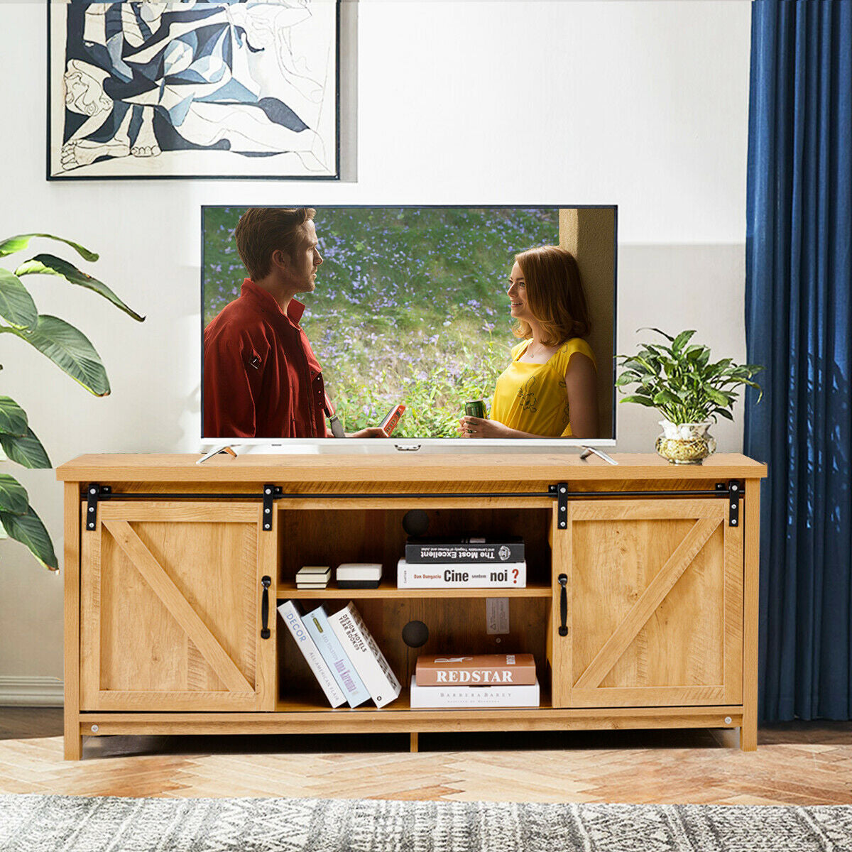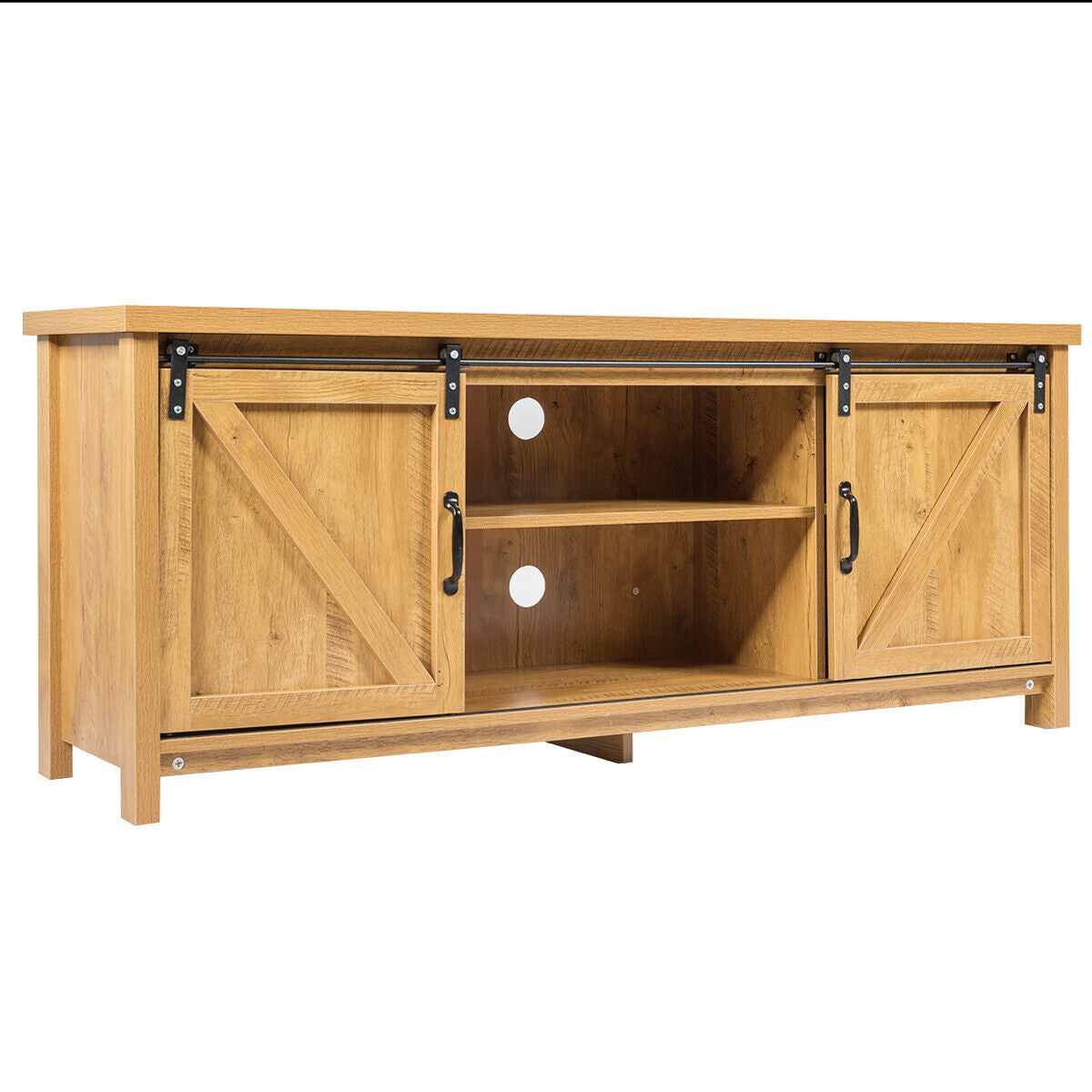 Made of environmental chipboard this TV stand is durable and beautiful. Because of the high quality material the TV ark is easy to clean and maintain. Except for that featuring stable structure with large weight capacity and ample storage space with two open center compartments and two cabinets this TV stand will definitely give you better using experience. It is worth mentioning that the TV cabinet adopts sliding barn door design which allows you to adjust the door position according to your own needs but also adds an aesthetic feeling.