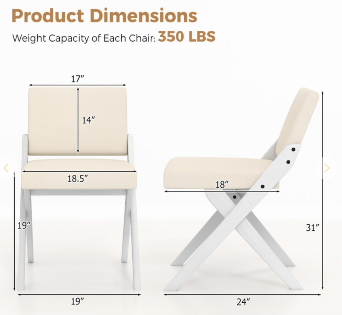 ● Easy Assembly: The padded dining chairs measure 19" x 24" x 31"(L x W x H), the seats measure 18.5" x 18" (L x W), and the seat heights are 19". With the simple structures and clear illustrations in the user's manual, the chairs are easy to set up.